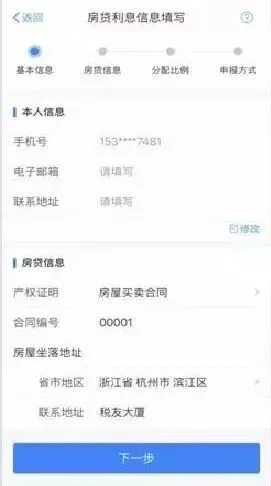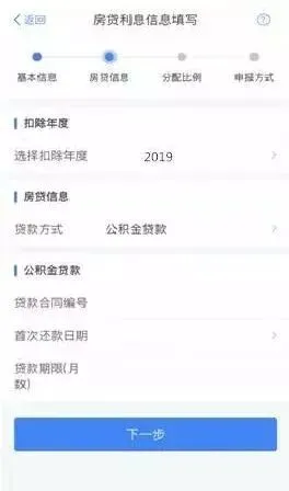 3.选择扣除年度以及贷款方式。贷款方式分为公积金贷款、商业贷款、组合贷三种,至少填写其中一项点击【下一步】;
