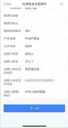 4.出租方类型分为自然人和组织,需要录入对应类型的出租人身份证件信息或出租单位统一社会信用代码(纳税人识别号),点击【下一步】;