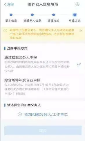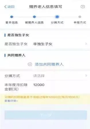 4.选择是否独生子女。独生子女,分配比例为全部由本人扣除;非独生子女,需录入共同赡养人、本年度月扣除额并选择分摊方式(赡养人平均分摊、赡养人约定分摊、被赡养人指定分摊),点击下一步;