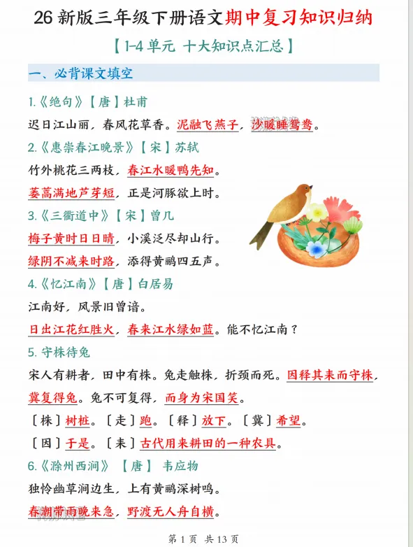26新三年级下册语文期中复习知识点归纳,电子版可打印 今天分享的是26新三年级下册语文期中复习知识点归纳,提供电子版,支持打印和下载。 (温馨提示:文末有完整电子版领取方式) 免费领取完整电子版: ①:关注下方公众号:学习升华网 ②:在公众号对话框中回复:5057 重要事情说三遍: 关注公众号《学习升华网》,在公众号后台回复代码,不是在文章里面留言!! 关注公众号《学习升华网》,在公众号后台回复代码,不是在文章里面留言!! 关注公众号《学习升华网》,在公众号后台回复代码,不是在文章里面留言!!