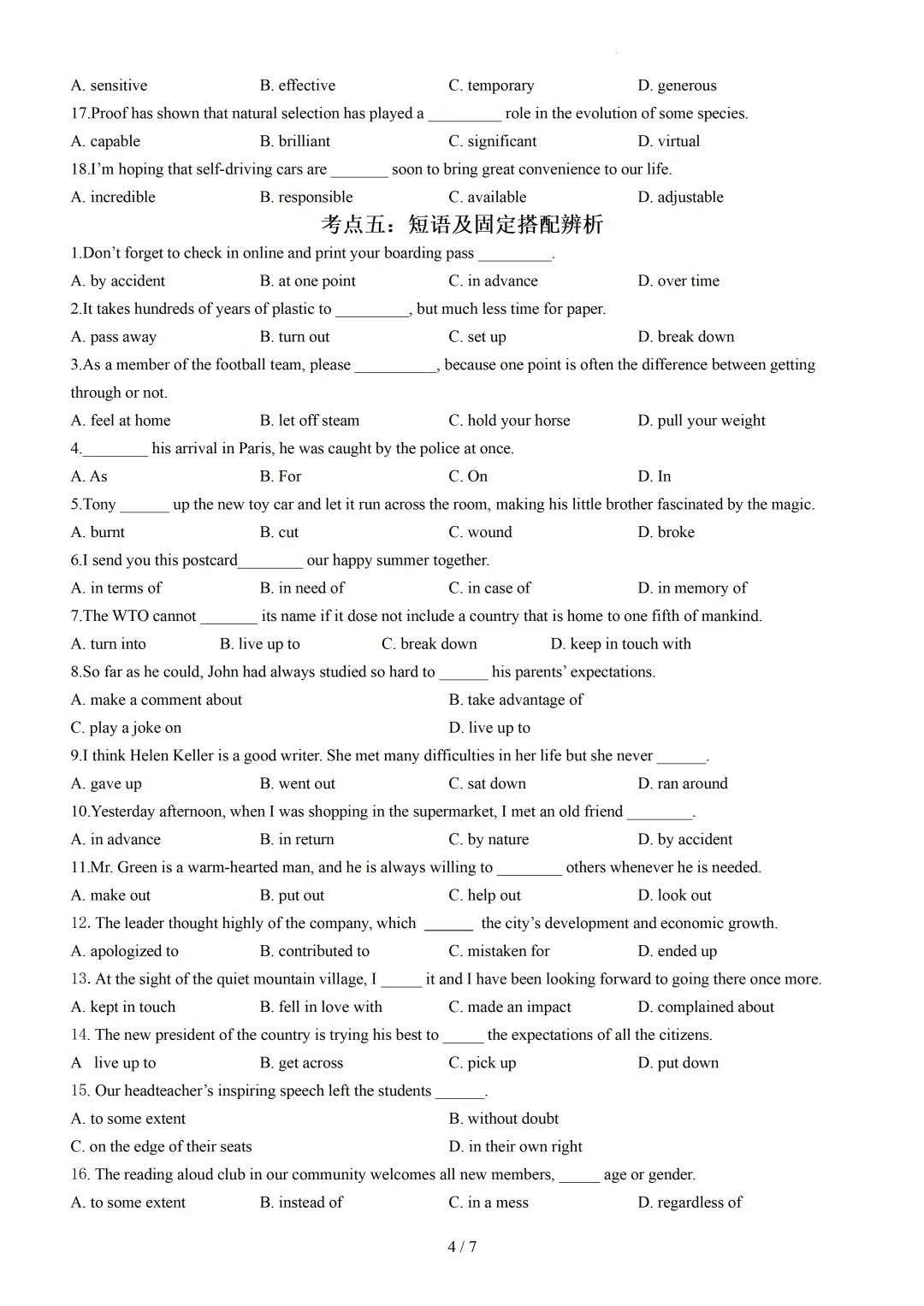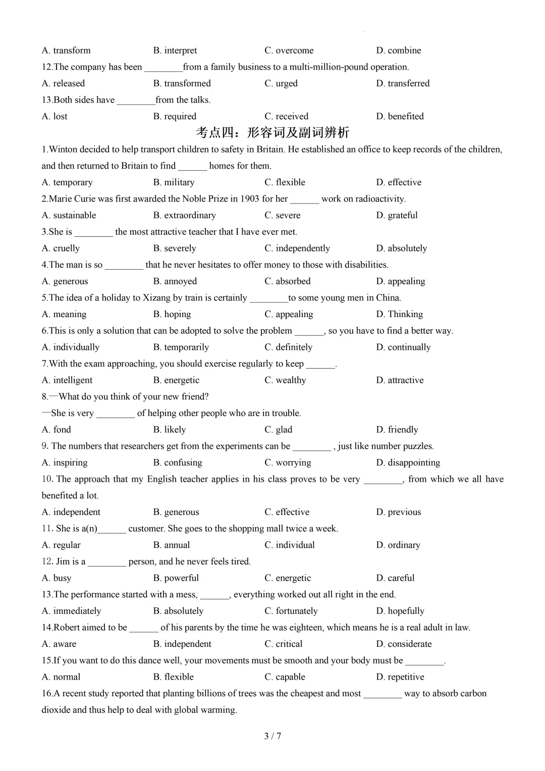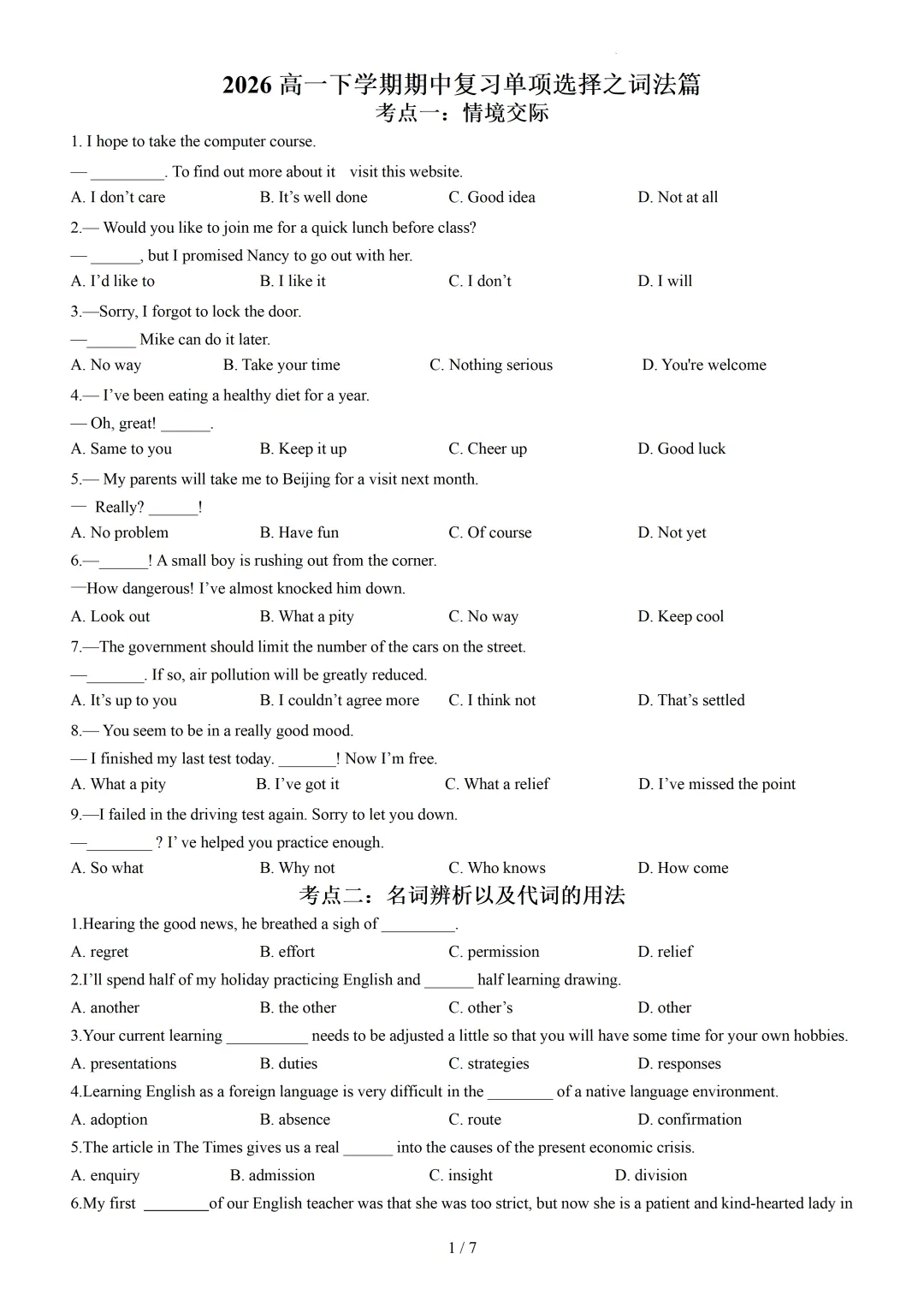 【可下载】2026高一下学期期中复习单项选择之词法篇(附解析) 点击上方“蓝字”免费关注! 本套试卷+答案解析下载入口 关注“卿卿侃古今”公众号 点击左下角阅读原文可下载 相关链接: 2007-2025年天津市高考英语真题汇总(持续更新中~) 2011-2023年天津高考英语听力真题在线测试 【高考英语听力在线测试】高考听力机考模拟试题大全(持续更新中) 【可下载】2025-2026年高中英语试题汇总(附解析)【持续更新中】 【汇总】高中英语月考和期中期末试题(持续更新中~) 【题库】高一英语试题汇编(持续更新中~) 【题库】高二英语试题汇编(持续更新中~) 【题库】高三英语试题汇编(持续更新中~) 【可下载】高三英语上学期期末试题16套(附解析) 【可下载】高二英语上学期期末试题10套(附解析) 【可下载】高一英语上学期期末试题汇9套(附解析) 【可下载】2025-2026学年度高一高二高三开学考试模拟试卷(天津专用)(附解析) 新外研版高中英语高清电子课本、课文原文和译文、单元同步复习资料和试题【持续更新中】 【目录1】高中英语阅读理解限时训练大全(持续更新中~) 【目录2】高中英语完形填空限时训练大全(持续更新中~) 【目录3】高中英语书面表达大全(持续更新中~) 【目录4】高中英语听力训练大全(持续更新中~) 【目录5】高中英语单选题大全(持续更新中~) 【目录6】高中英语语法题大全(持续更新中~) 【目录7】高中英语阅读表达题大全(持续更新中~) 【目录8】科普知识汇总 【目录9】中高考学法知识汇总 【目录10】高考英语真题+名校模拟真题+月考和期中期末试题(持续更新中~) 【目录11】暑期高考英语备考资料大全持续更新中~【汇总】中高考志愿填报资料大全 【汇总】高中英语月考和期中期末试题(持续更新中~) 【汇总】2025届高三英语一模试题(附解析) 【汇总】2024届高三英语一模二模三模试题(附解析) 【汇总】2024届高考英语押题卷(附解析) 【汇总】2025届高三英语周考综合练(附解析) 【题库】高三英语限时训练(持续更新中~) 【模拟】2025届高三英语听力机考模拟试题在线测试 【高考词汇】(新)外研版高中英语全七册词汇表(附音频) 【中考词汇】初中英语外研版必备单词表(完整版),可打印 建议收藏保存 点击阅读原文查更多