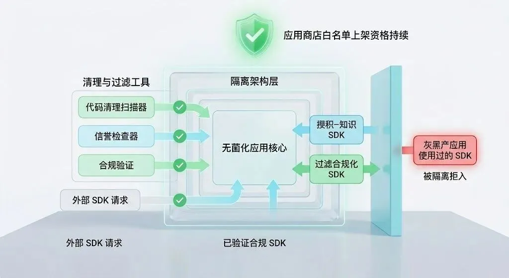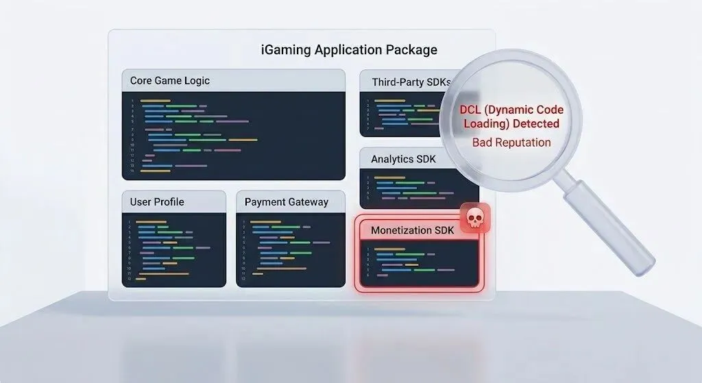 问题的根源往往不在于应用的主体业务,而在于那些被开发团队随意引用的 “第三方统计与变现 SDK”。 为了实现精细化的买量归因、用户行为分析或是增加额外的广告收入,开发团队常常在博弈应用的包体内集成各种数据 SDK。然而,应用商店的底层风控模型对 iGaming 这一高敏感类目的要求是绝对的无菌化。 一旦平台安全探针在您的包体内扫描到某个 SDK 携带了疑似“动态代码加载(DCL)”的后门、或者该 SDK 曾在历史中被其他灰黑产应用广泛使用(名声败坏),您的合规博弈应用将瞬间被“株连”,直接判定为恶意软件(Malware)或潜藏欺诈风险,强制从商店剔除。 本文将客观剖析博弈应用底层依赖的合规清理准则与隔离架构实操。