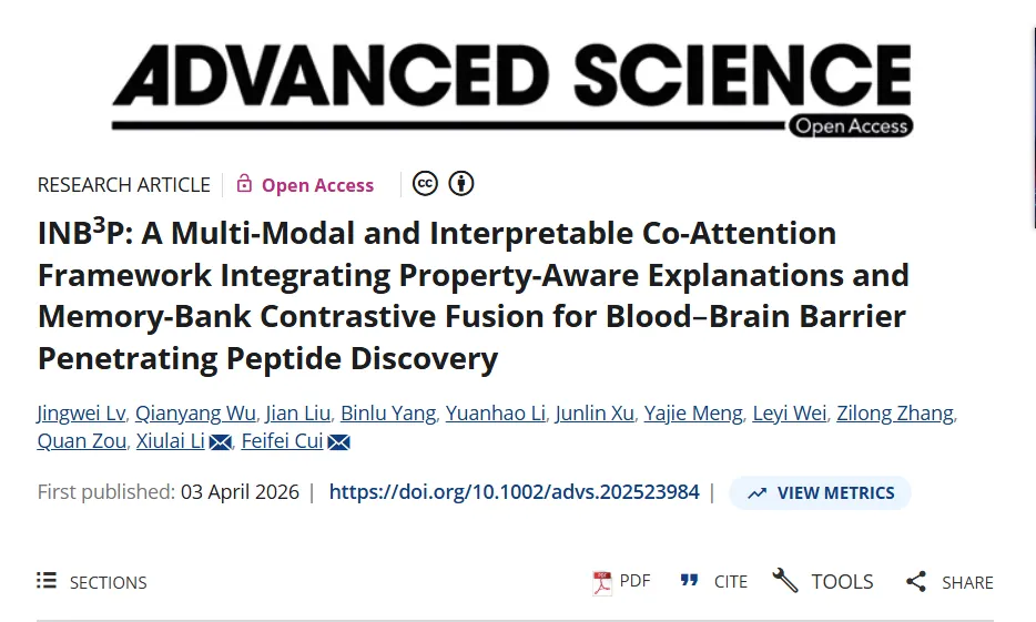 研究成果于2026年4月3日以题为“INB³P: A Multi‐Modal and Interpretable Co‐Attention Framework Integrating Property‐Aware Explanations and Memory‐Bank Contrastive Fusion for Blood–Brain Barrier Penetrating Peptide Discovery”发表在《Advanced Science》上。