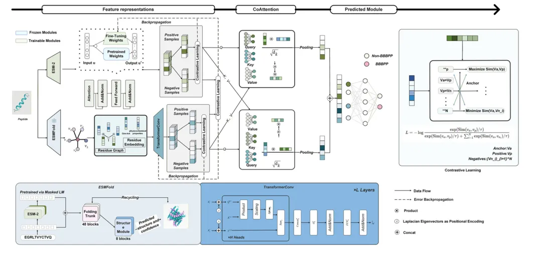 图1:INB³P框架的整体架构。图1展示了INB³P的多模态架构:序列由ESM-2编码,结构经ESMFold预测并转为含理化特征的残基图;两者通过双向共注意力对齐融合。训练分两阶段:先用对比学习塑造潜在空间,再用Focal与Stable-MCC损失抗不平衡微调。左下为结构提取模块,右下为图卷积层细节。整体实现了序列-结构协同与可解释性。