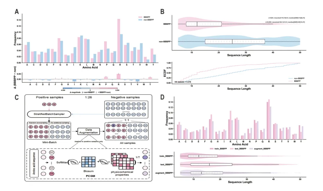图2:BBBPP数据集的统计特征及PCGM数据增强框架概述。图2系统展示了BBBPP数据集特征与PCGM增强策略。A显示BBBPP与非BBBPP在氨基酸频率上差异微小(<0.05),但长度分布存在显著差异(KS=0.376)。B表明BBBPP普遍较短。C描述了过采样与PCGM流程:融合BLOSUM62与理化相似性核,生成保守突变。D验证增强集在组成和长度上与真实BBBPP高度一致,证明PCGM能忠实扩充正类多样性而不引入统计失真,为后续建模提供了可靠数据基础。