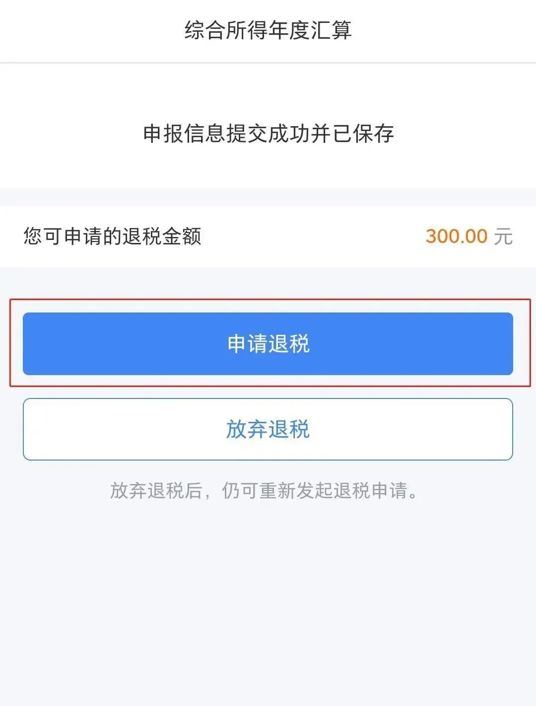 申报完成后,如您存在可退税金额的,点击“申请退税”按钮即可发起退税申请;如您选择放弃退税的,点击“放弃退税”即可。