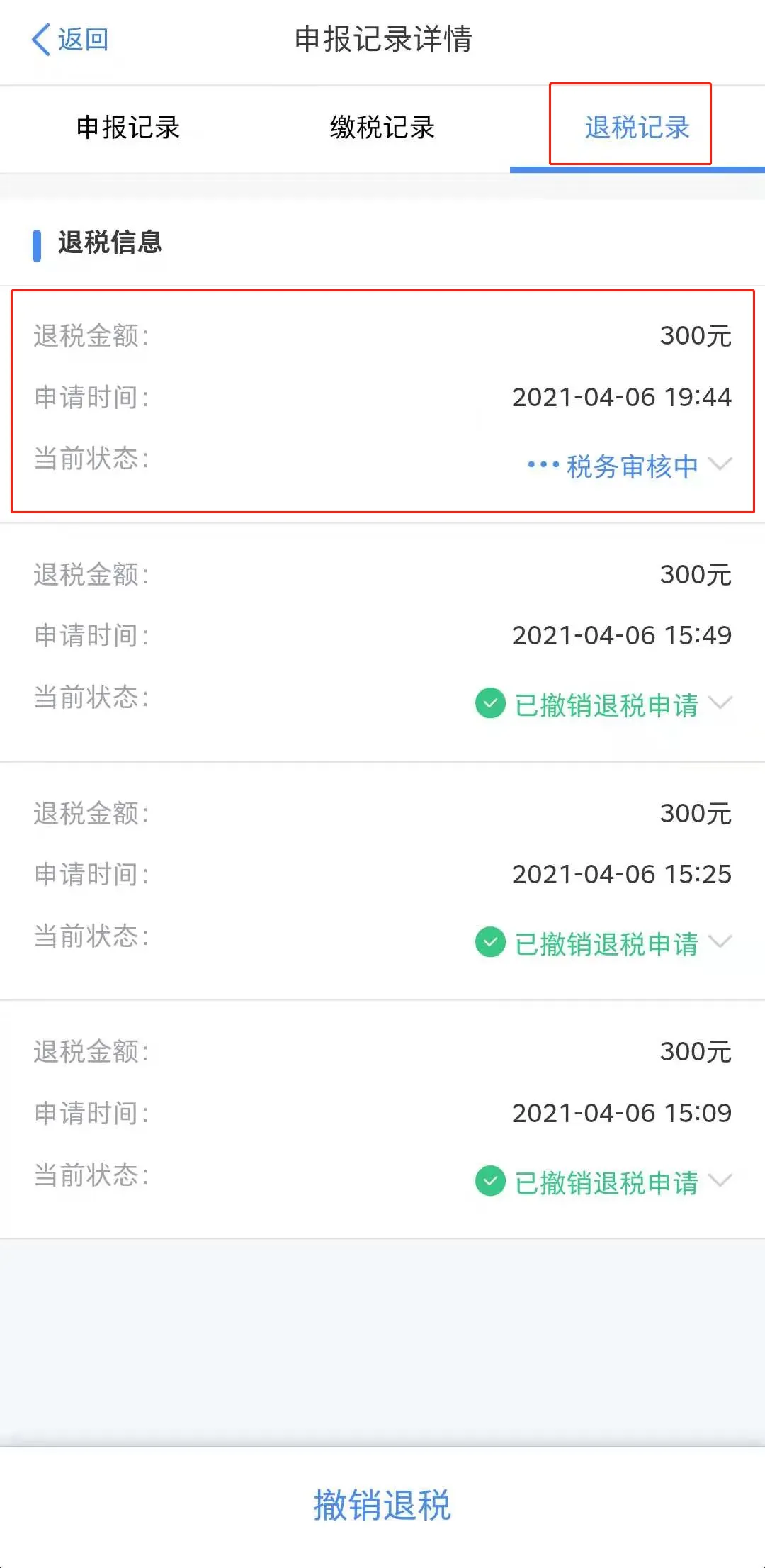 您可以在首页【服务】—【申报信息查询】—【申报查询】,点击“已完成”的申报记录,进入“申报记录详情”页面点击“退税记录”可查看退税状态,如“已撤销退税申请”、“税务审核中”等。