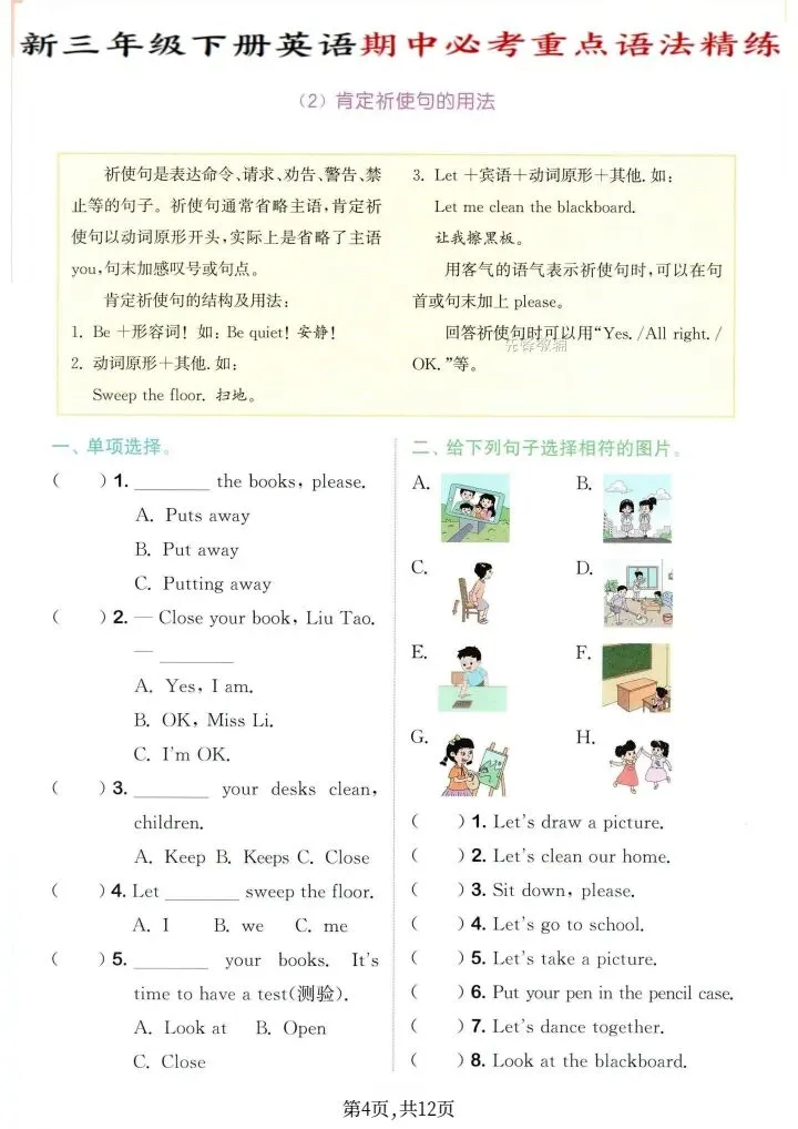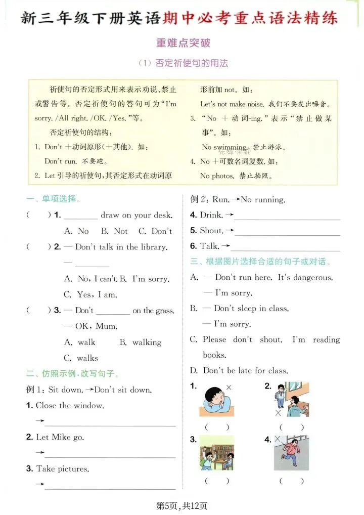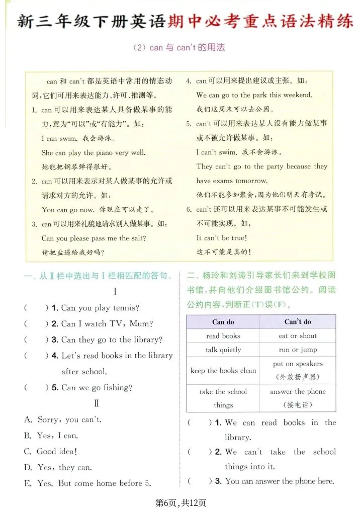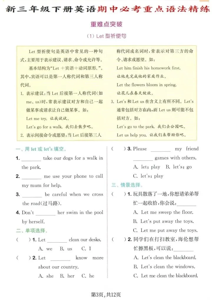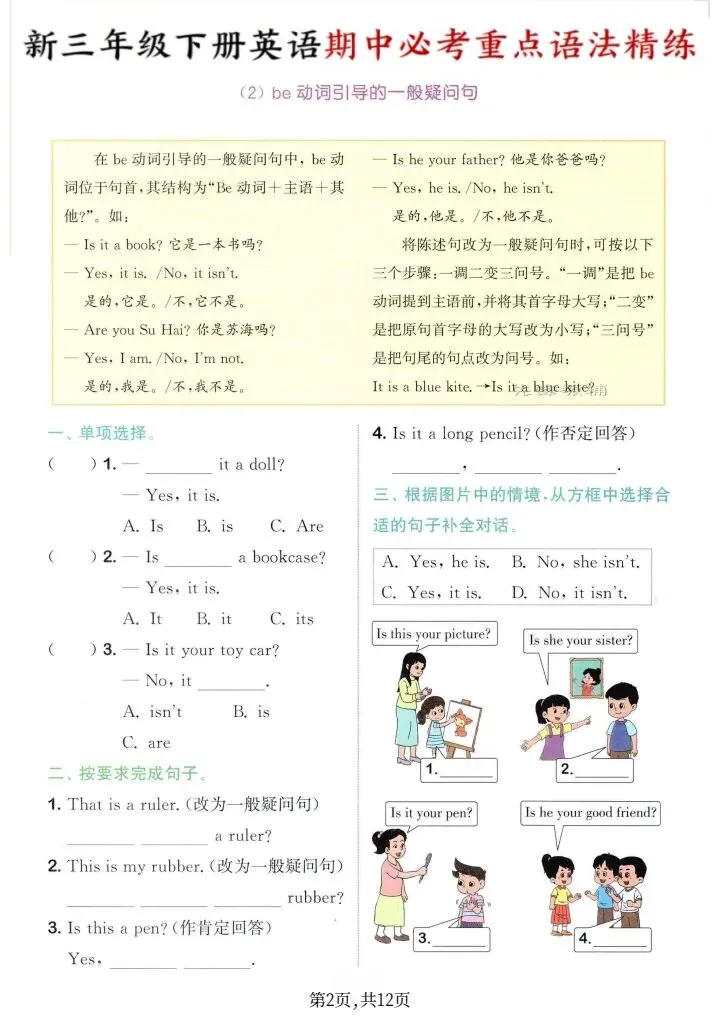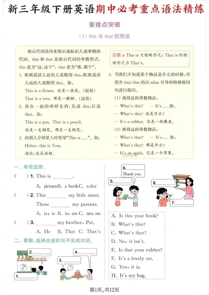 2026年新译林版三年级下册英语期中必考重点语法精练(电子版可打印)