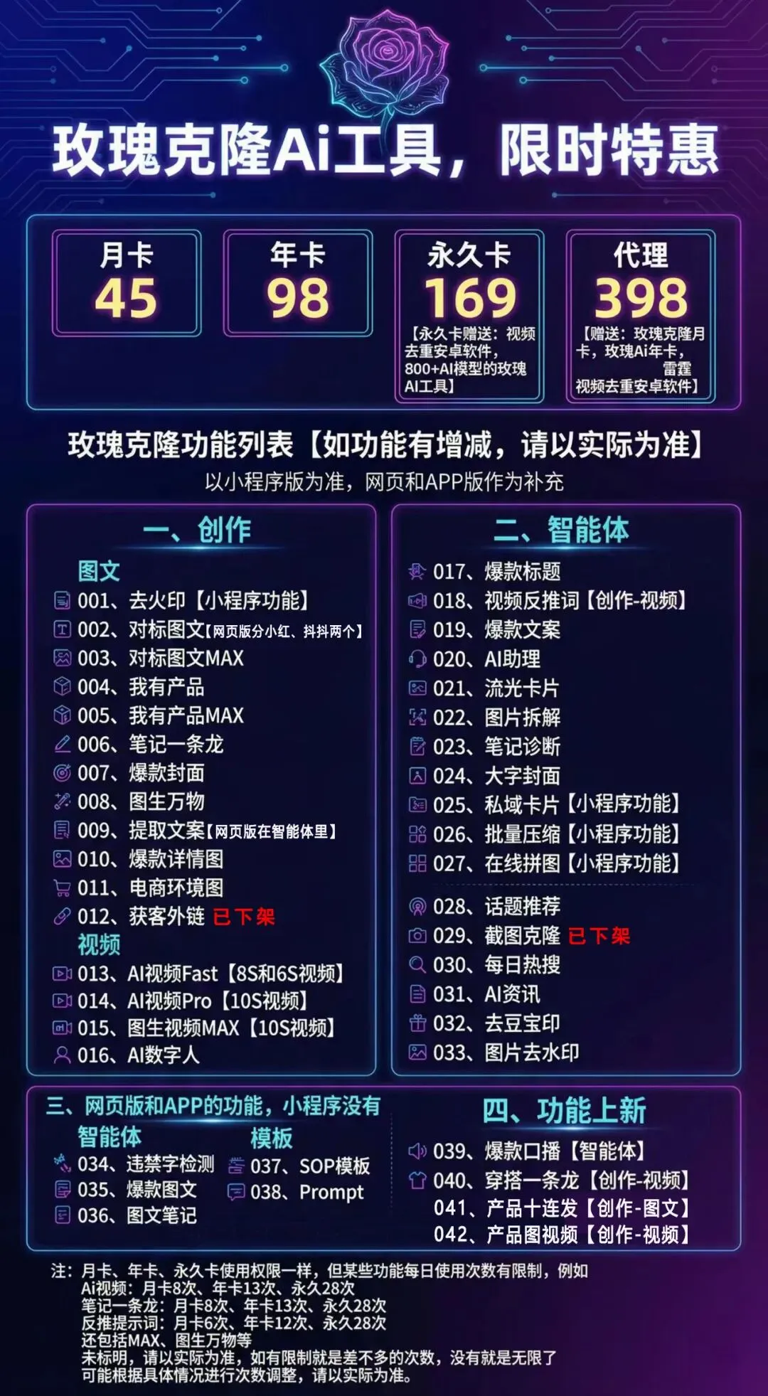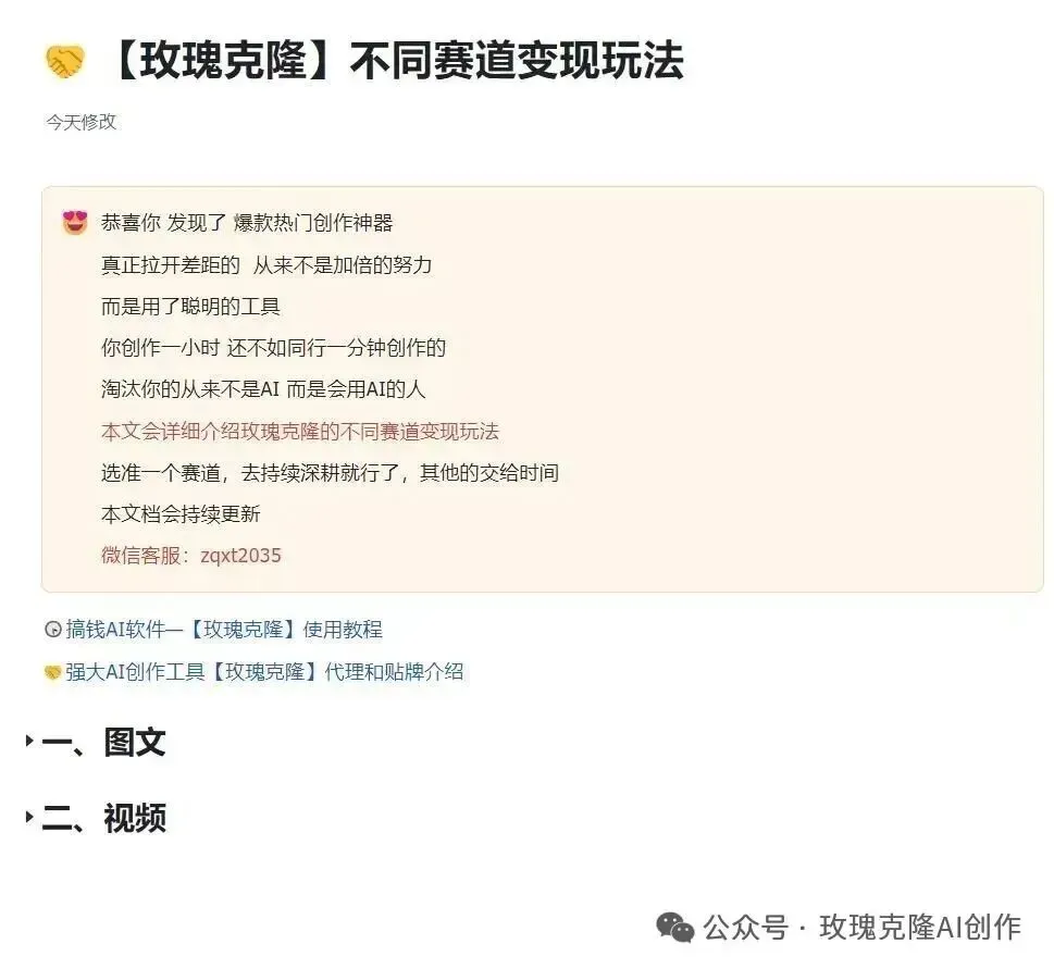 【玫瑰克隆Ai工具】功能上新:产品十连发+产品图视频 你好,这里是玫瑰克隆 玫瑰克隆又又又上新功能了 👇看视频👇 最新功能列表首发 你好,这里是玫瑰克隆 下期见 如有需要 别再观望了 迈出第一步永远比纠结更重要 赚钱这件事 执行力永远比天赋更值钱。 关于 如何79拿下 玫瑰克隆代理+玫瑰克隆工具永久使用权 👇请看下面文章👇 如何79元拿下玫瑰克隆代理