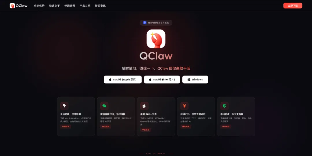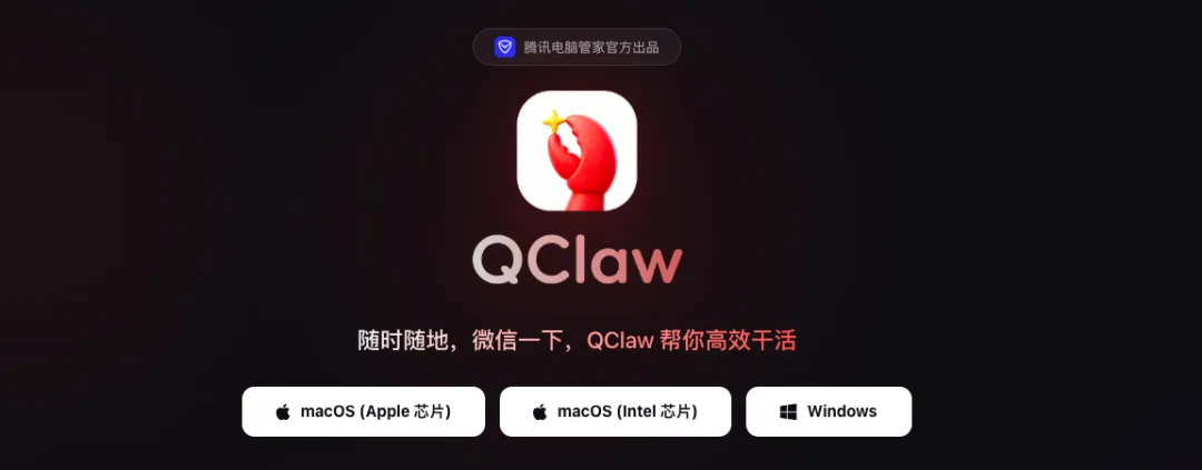 根据自己的电脑系统前往官网下载 QClaw,选对版本安装即可。