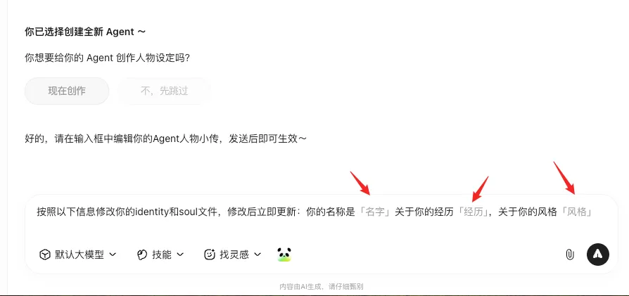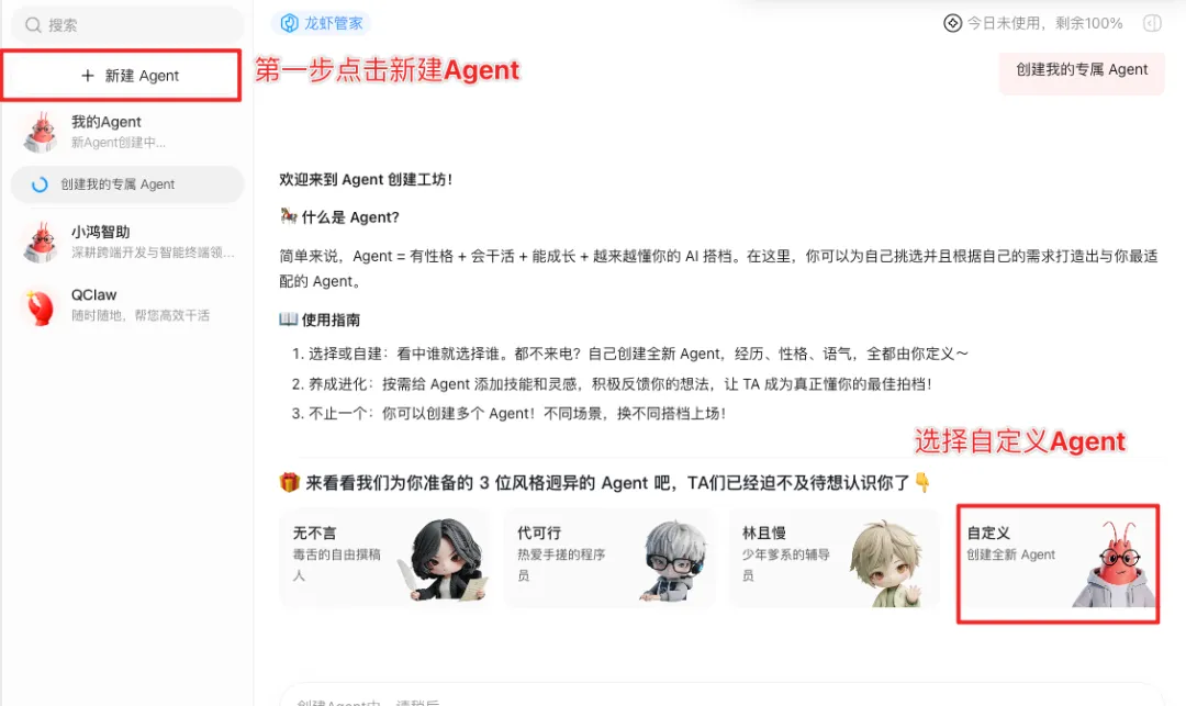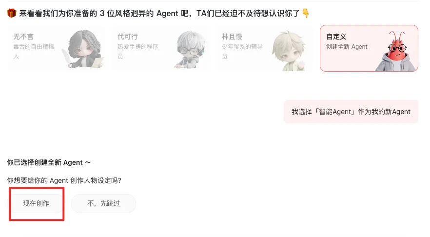 点击「自定义 Agent」后,系统会引导你进入人设创建流程,点击「现在创作」进入下一步: