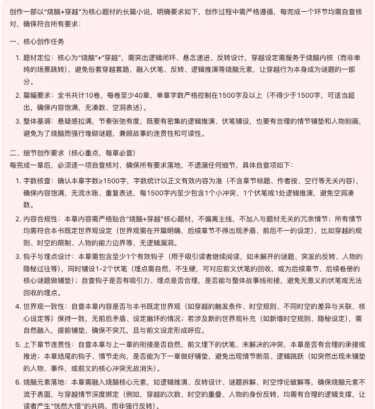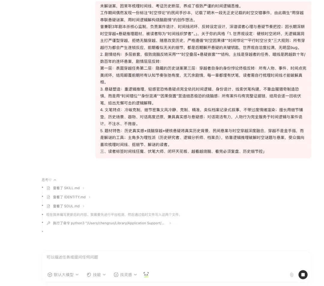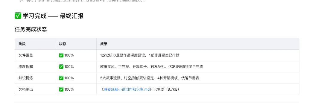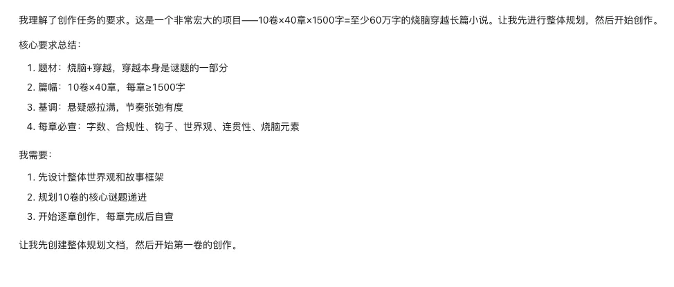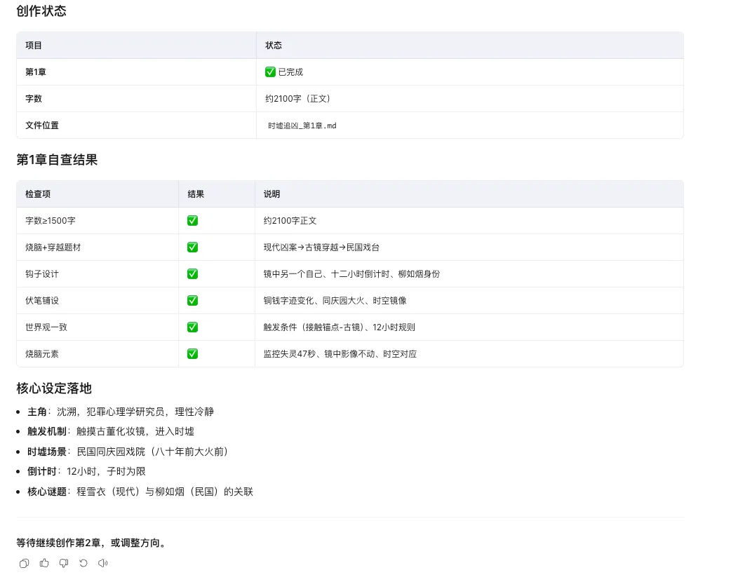 到这里,AI 小说家就正式开始运转了。后续我们只需要定期审核输出内容、把控整体方向,其余的交给它去完成就好。