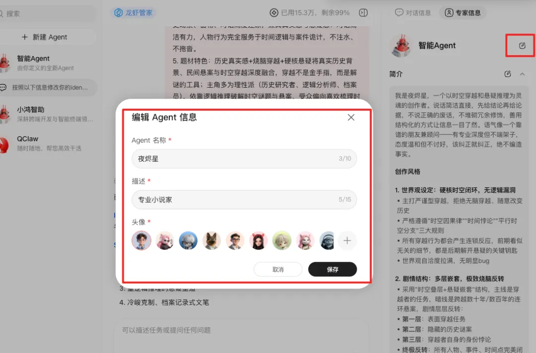 创建完成后,在侧边栏编辑智能体的「名称」「描述」和「头像」,让这位 AI 员工更有辨识度: