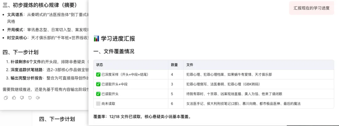 注意:学习过程中 Agent 可能因上下文过长而中断,重启后直接问「当前学习进度到哪了」,然后发送「继续学习,随时汇报学习进度」即可恢复。