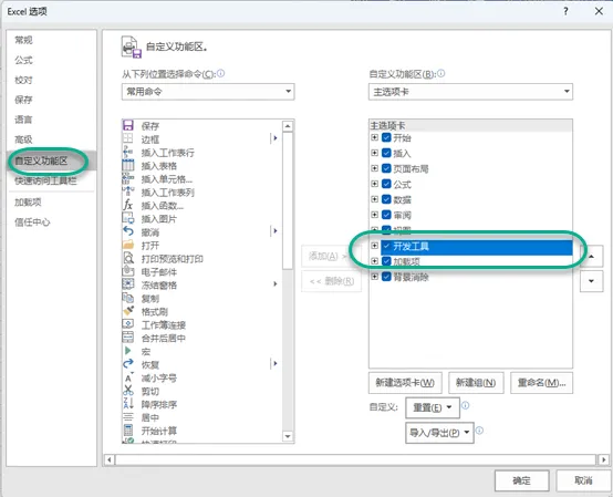 3、Excel选项中的自定义功能区 勾选开发工具