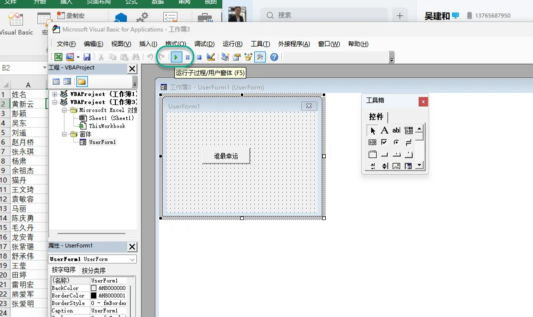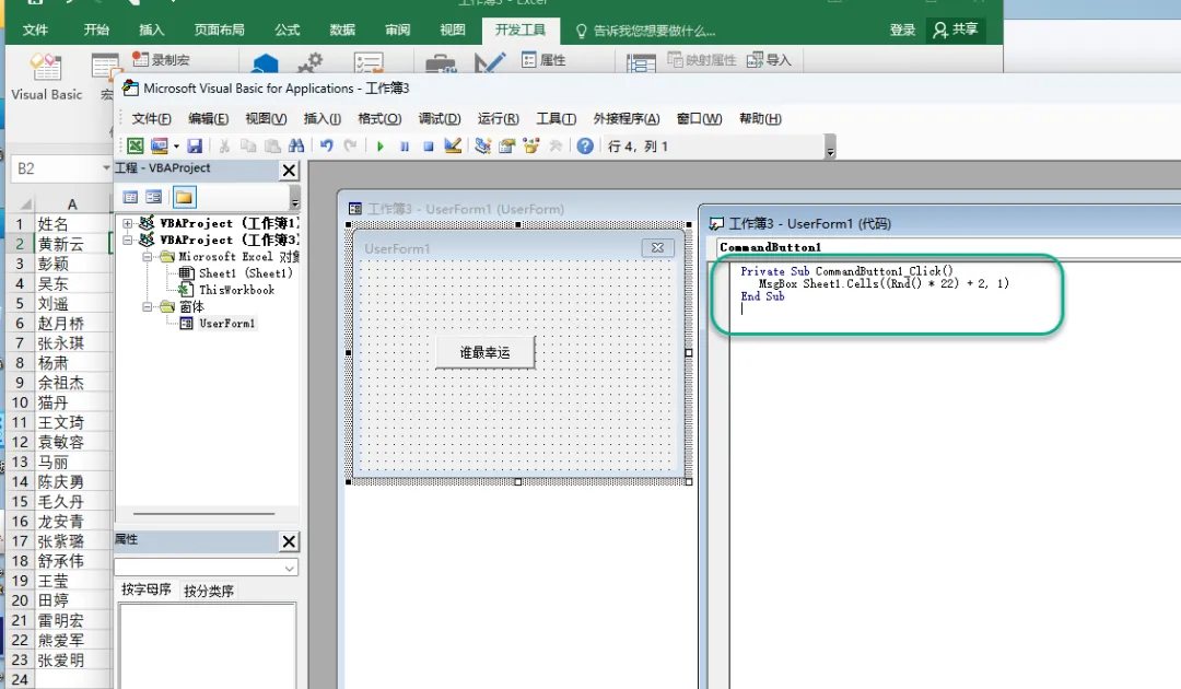 6、在窗体中添加一个按钮,将按钮命名为“谁最幸运”,双击此按钮,在按钮代码中输入Msgbox Sheet1.Cells((Rnd()*22)+2,1)