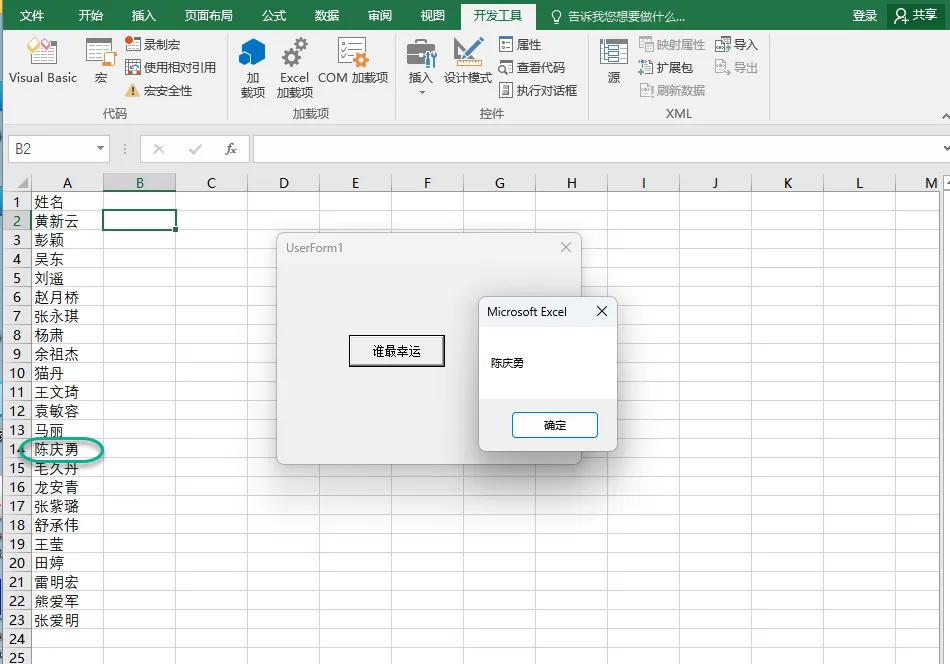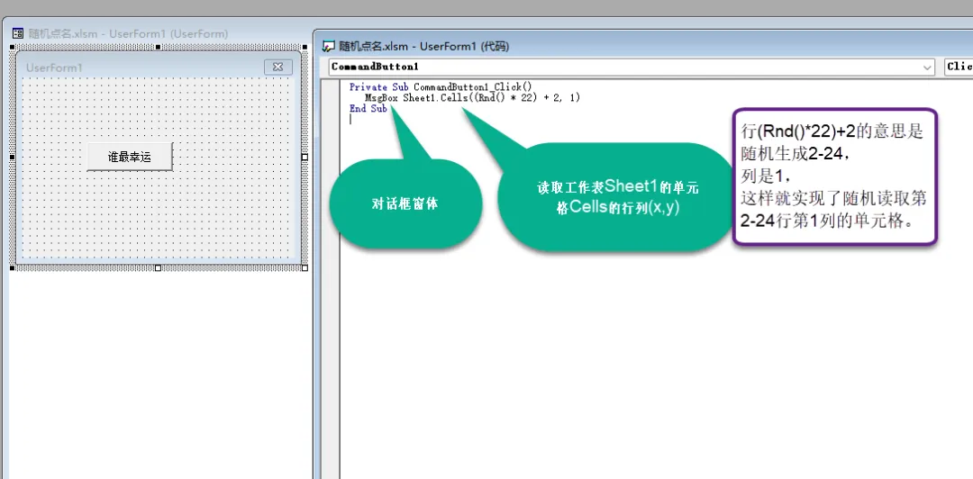 行x=(Rnd() * 22) + 2,Rnd()随机生成0-1的随机数,Rnd()*22就是随机生成0-22的数,因为单元格具体姓名是从第二行开始,所以+2。