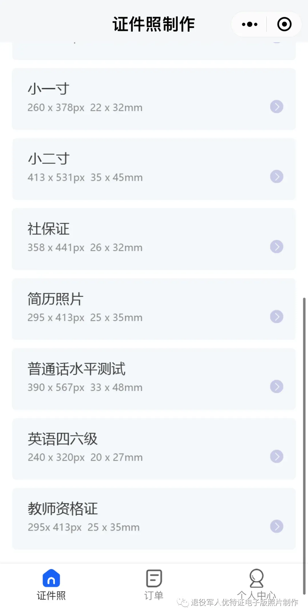 (三)身份证、驾驶证、社保证、简历、普通话水平测试、英语四六级、教师资格证选项等。可以点击“证件照制作”页面的热门证件照,找到需要的选项,点击进入,跳转到拍摄页面。(如下图)