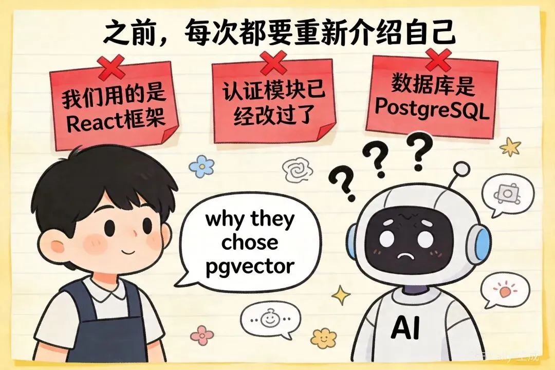 每次打开一个新的AI对话窗口,都要从头交代一遍背景——”我们用的是React框架””认证模块已经改过了””数据库是PostgreSQL”……说了八百遍,它还是忘。