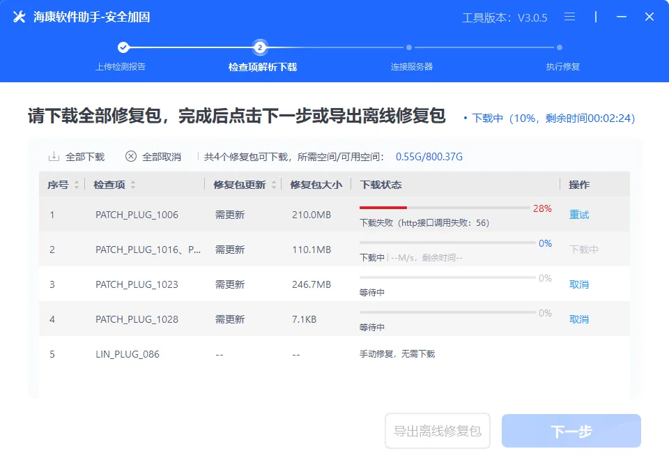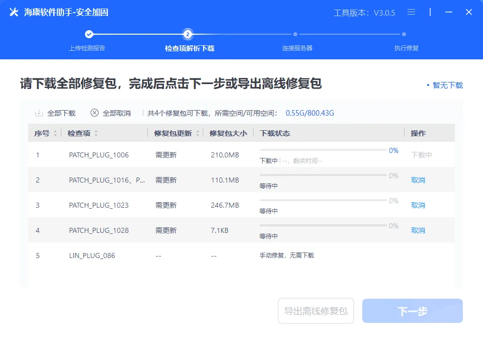 步骤七:会自动跳出修复程序,请下载全部修复包后进行修复(此步骤可断开平台,电脑连接互联网下载修复包)