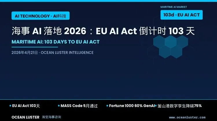 EU AI Act 倒计时 103 天,IMO MASS Code 5 月通过在即。航运、法律、保险、合规四条赛道在 2026 Q2 同步跨越”试点—生产”分水岭——谁在今夏前做完合规文档与数据底座,谁就拿走下半年的全部红利。