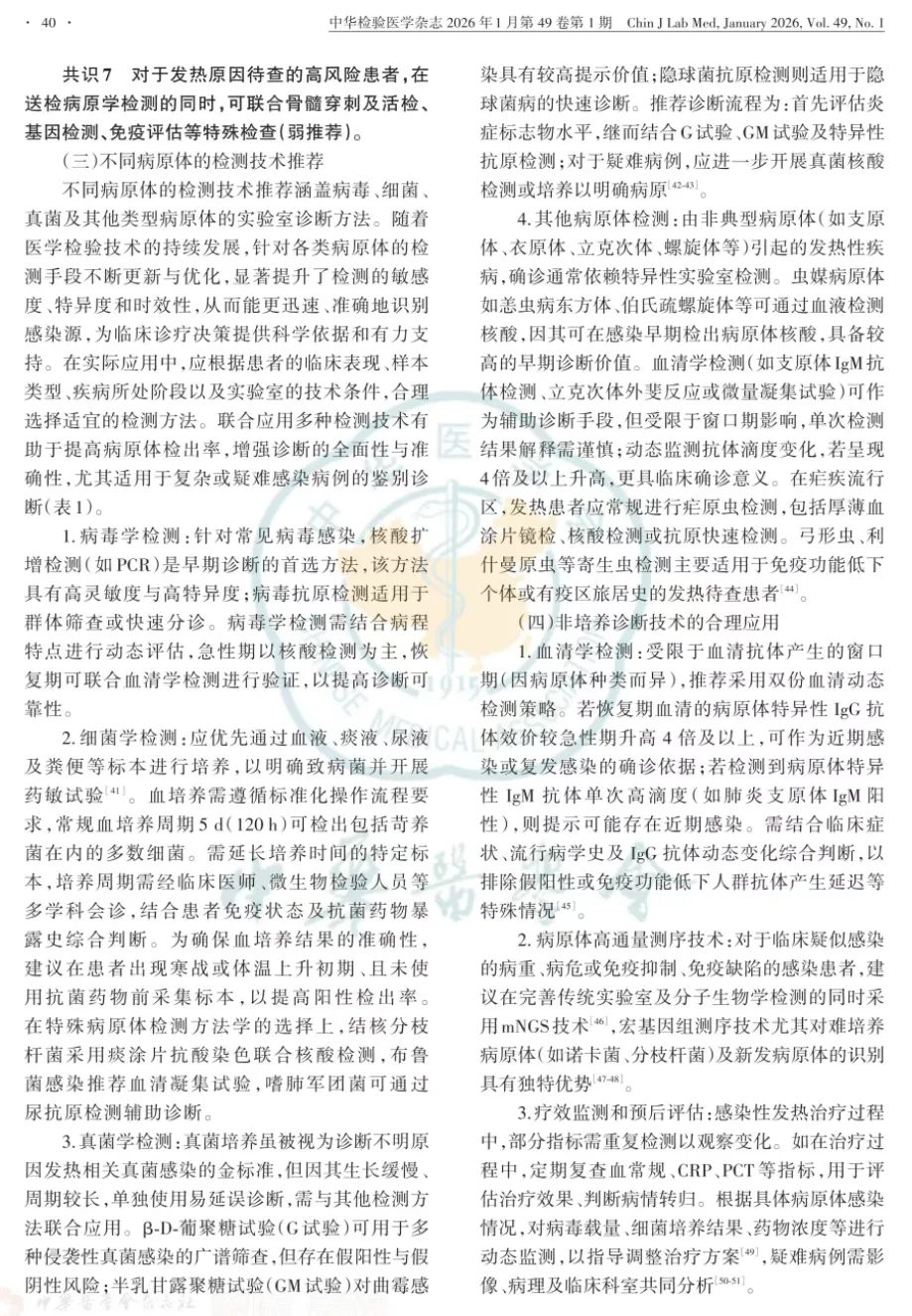 共识11对长期反复不明原因发热的高风险患者,医疗机构检验科需基于病情的动态进展,选择适宜的实验室检查项目组合,避免固定方案导致漏诊(强推荐)。