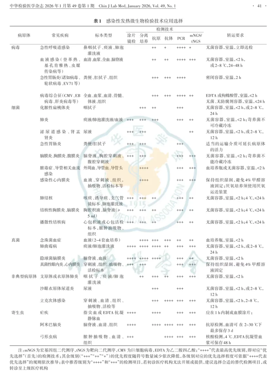 共识2医疗机构检验科应具备依据患者发热持续时间、热型、起病特点及伴随症状开展靶向检验项目的能力,宜提供对应的检验组合方案,辅助临床制定治疗策略(强推荐)。