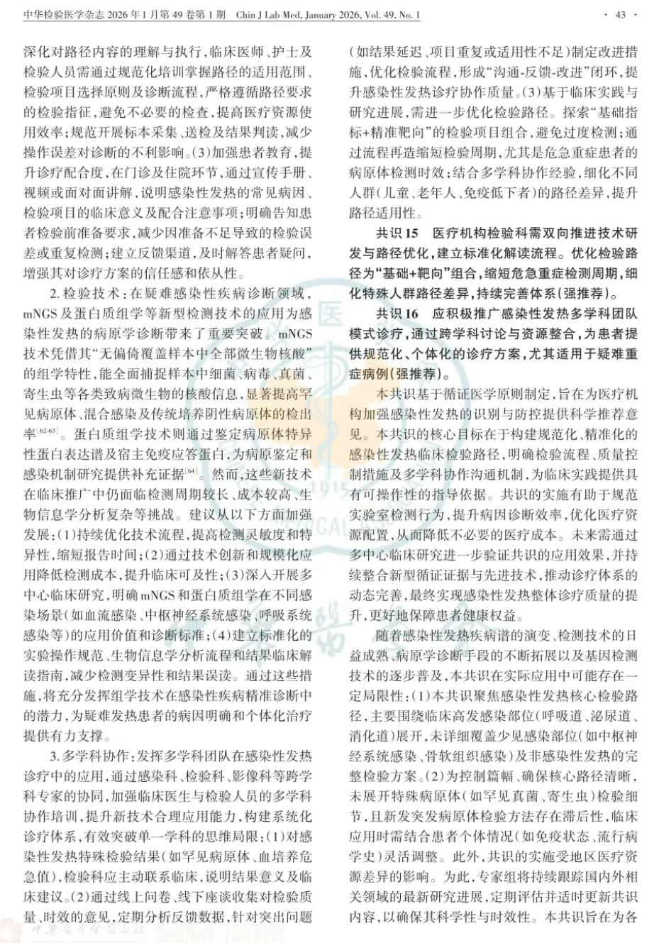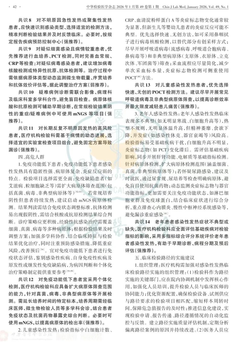 共识14老年患者感染性发热症状不典型或缺失,医疗机构检验科应全面评估基础疾病对检验指标的影响,采用多指标综合评分系统评价老年患者感染性发热,有助于早期诊断、病程分期及预后评估(强推荐)。