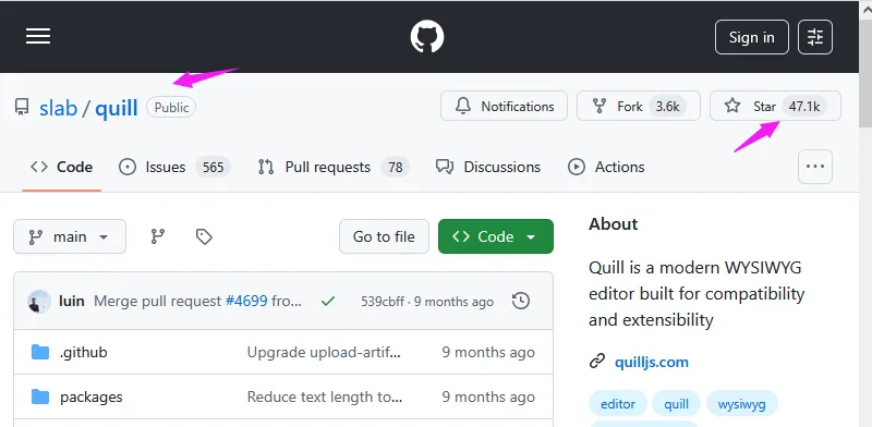 之前一直用老牌的富文本编辑器KindEditor,前两天想看一下官网发现打不开了,于是就是想找一款新的流行的、好用的替代产品。一通寻找下来Quill活跃维护,star数亮眼。