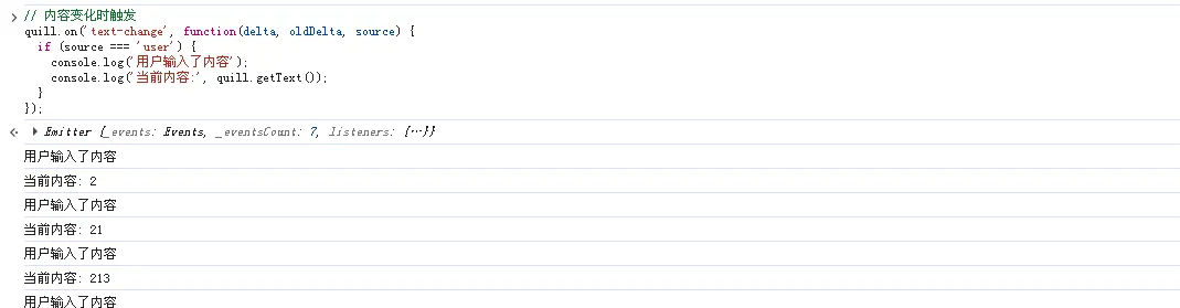 // 内容变化时触发quill.on('text-change', function(delta, oldDelta, source) { if (source === 'user') { console.log('用户输入了内容'); console.log('当前内容:', quill.getText()); }});// 选择区变化时触发quill.on('selection-change', function(range, oldRange, source) { console.log('选区变化:', range);});
