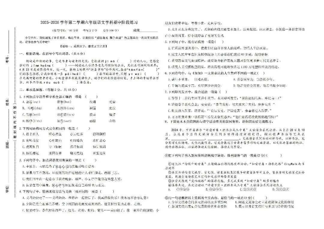六年级下册期中模拟卷①附答案(免费下载) 温馨提示:点击文末阅读原文可下载 声明:素材来源网络,本文意在交流学习,普及知识,如涉及版权等问题,请及时与我们联系。 领取方式 点击下方信息后 发送消息“期中模拟”即可领取 领取电子版请戳这里~