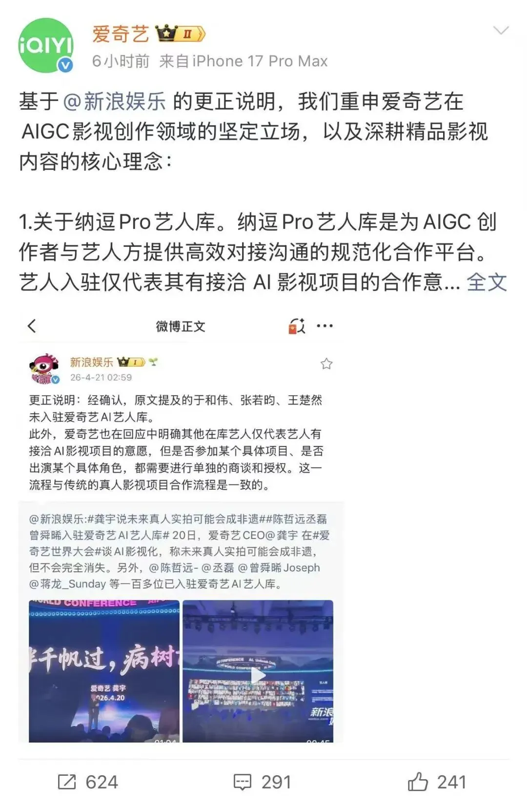 2.关于AI技术对影视创作的积极影响。爱奇艺始终尊重包括艺人在内的所有创作者,这是我们最重要的基本原则。在20日爱奇艺世界·大会上,我们已充分表达:推动AIGC影视创作的核心价值在于降低创作门槛,助力优秀创作者打破技术与资源壁垒,让创作者特别是年轻创作者获得更多机会,创作出更多好作品。