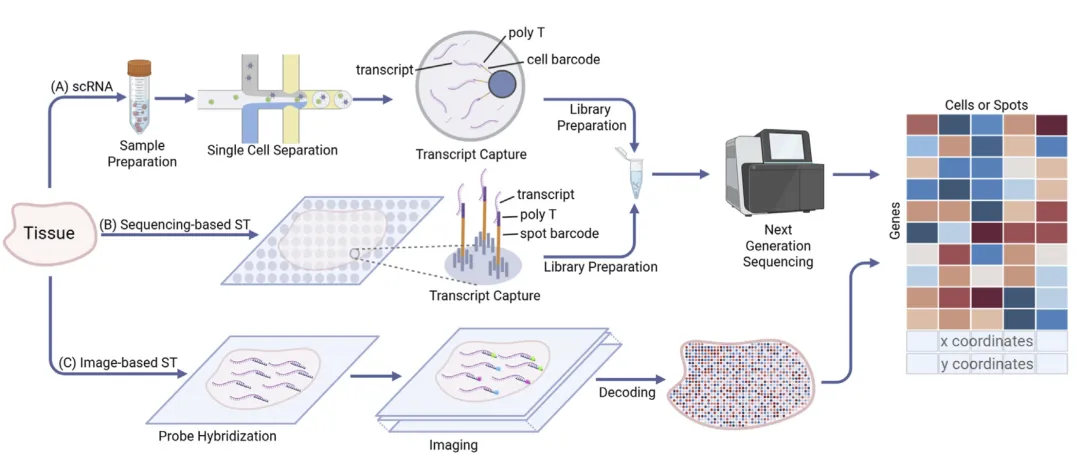 从组织样本出发,scRNA-seq、测序型空间转录组和成像型空间转录组分别通过不同路径生成表达数据;其中空间转录组额外保留了空间位置信息,这也是后续AI模型能够整合表达、空间与图像信息的基础。