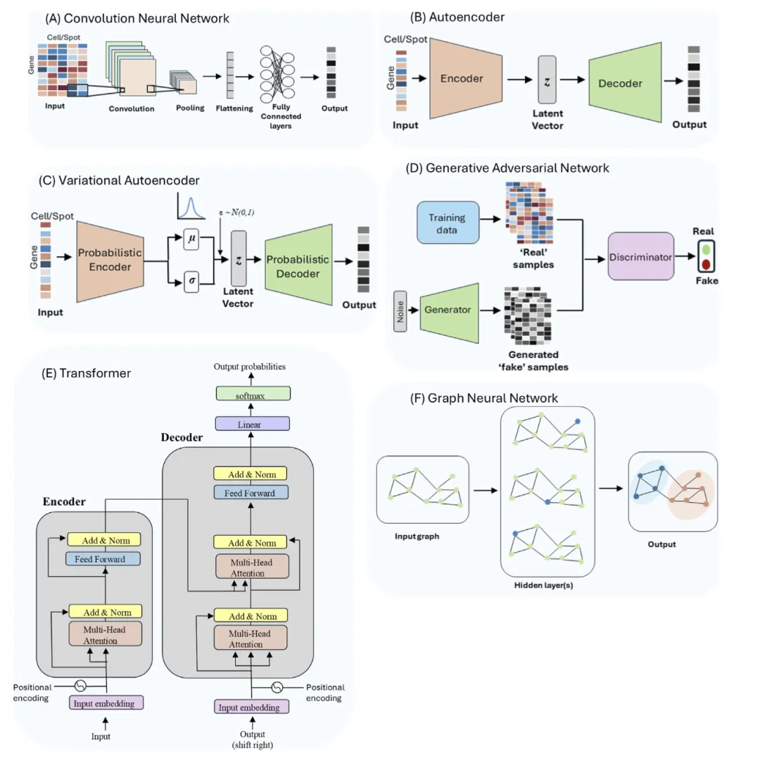 包括卷积神经网络(CNN)、自编码器(AE)、变分自编码器(VAE)、生成对抗网络(GAN)、Transformer 和图神经网络(GNN)。不同模型各有分工:有的擅长降维与表示学习,有的适合生成与补全,有的更适合处理图像、空间邻接关系和多模态整合。