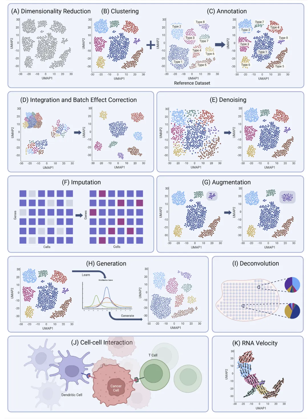 包括批次整合、去噪、插补、数据增强、数据生成、空间去卷积、细胞通讯分析和RNA velocity 等。需要注意的是,并不是所有任务都同样适合AI:有些场景中AI能显著提升多模态整合能力,但在差异分析等强调严格统计解释的任务中,过度依赖AI反而可能引入伪信号。