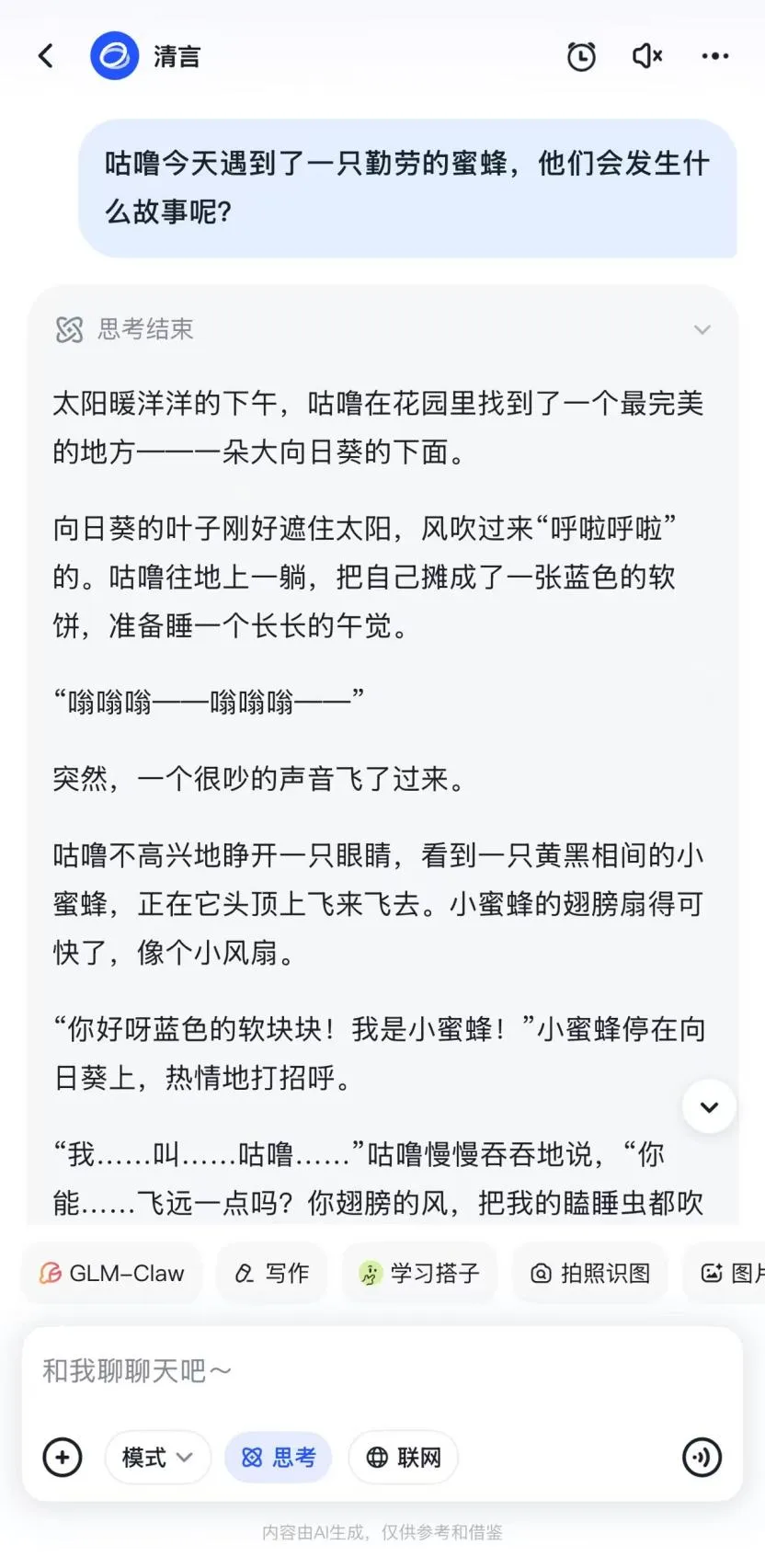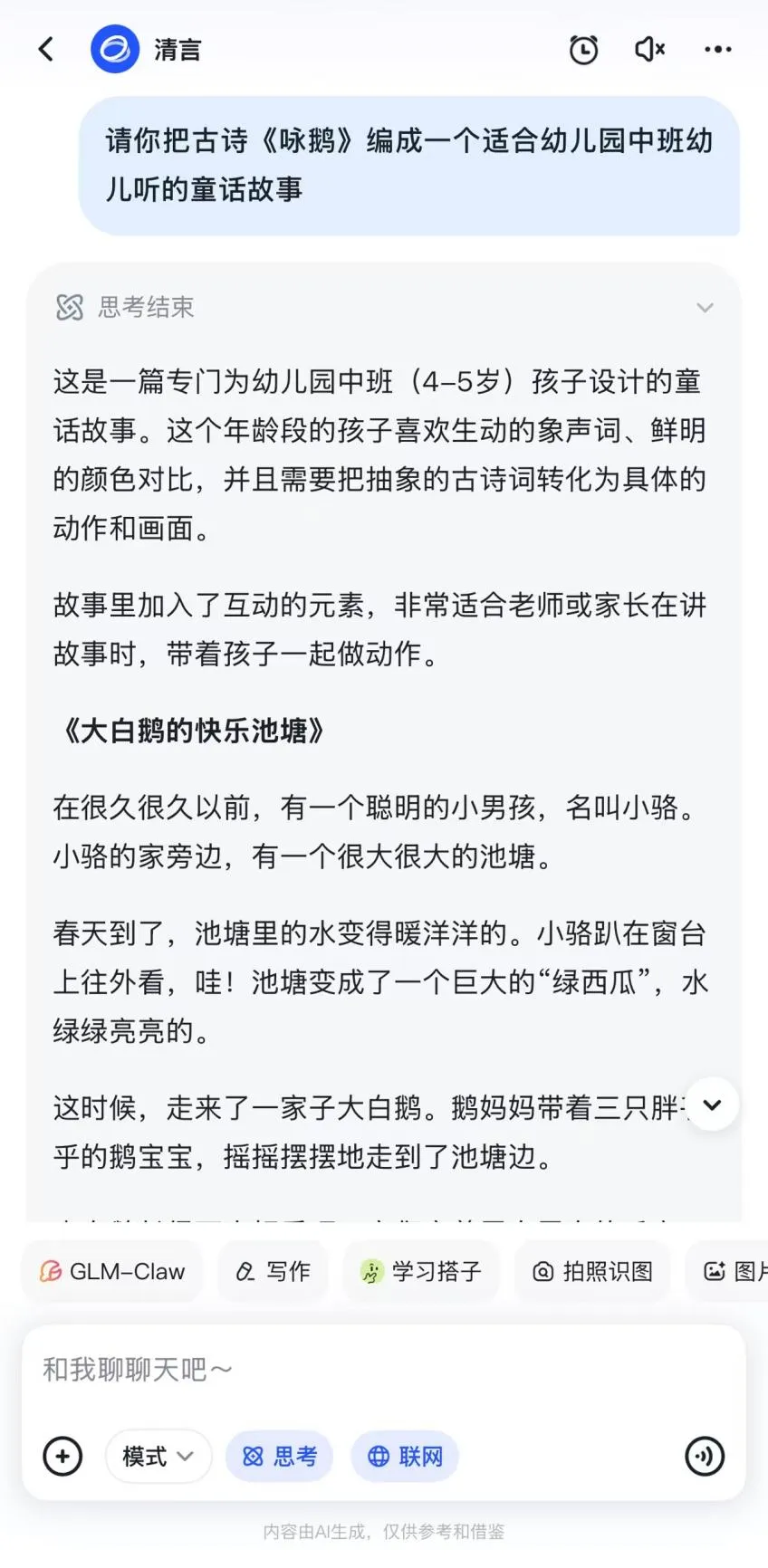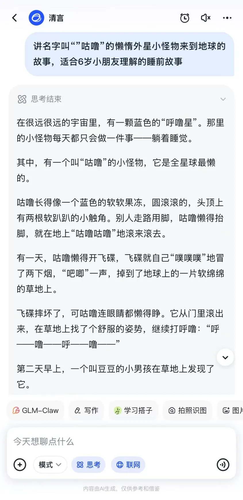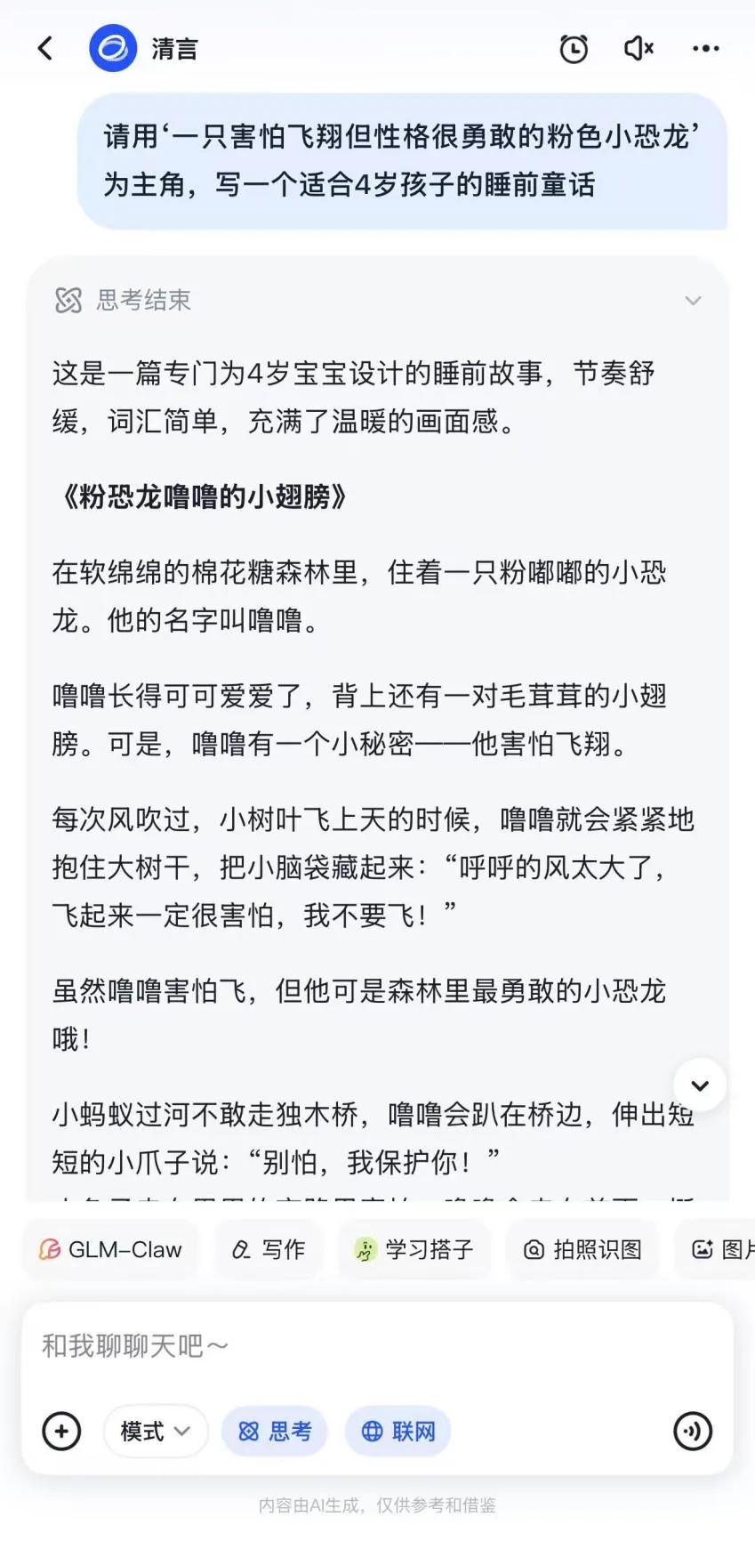 只要把孩子的想象告诉智谱清言,比如输入“请用‘一只害怕飞翔但性格很勇敢的粉色小恐龙’为主角,写一个适合4岁孩子的睡前童话。”,它立刻就能生成情节完整的专属故事。它非常擅长根据“性格”推动情节——贪吃的小熊会遇到美食冒险,胆小的小兔子会慢慢变得勇敢,让阅读变成生动的情感教育。