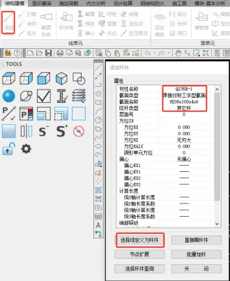 点击【添加杆件】弹出的对话框中【选择线定义为杆件】来定义杆件,材性、截面及弦杆类型可以双击修改。