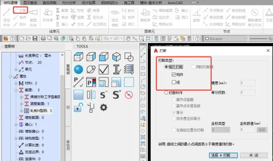 定义完杆件后,每根杆件会根据截面不同,显示不同的颜色,由于是采用【选择线定义】为杆件,杆件和杆件相交处没有被打断,选择【打断】弹出对话窗中的【相交打断】可将构件在相交处打断。还可以通过设定【离节点距离】、【等分】等多种方式打断杆件。