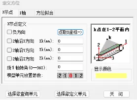 【方位】:相当于定义了构件的局部坐标(在构件信息显示中,可以选择显示构件局部坐标);定义方位指定义K节点坐标,从而确定由单元两端的i、j节点与K节点这三个节点所构成的平面在空间的位置(对工字形钢来说是确定了腹板平面),进而确定单元的摆放方位。