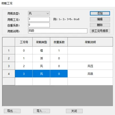 建立完结构模型后,进入【施加荷载】,首先需定义【荷载工况】,对于雨棚,可定义恒载、活载、风压力及风吸力。