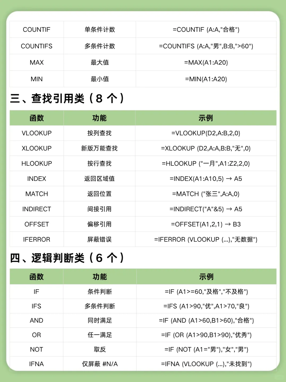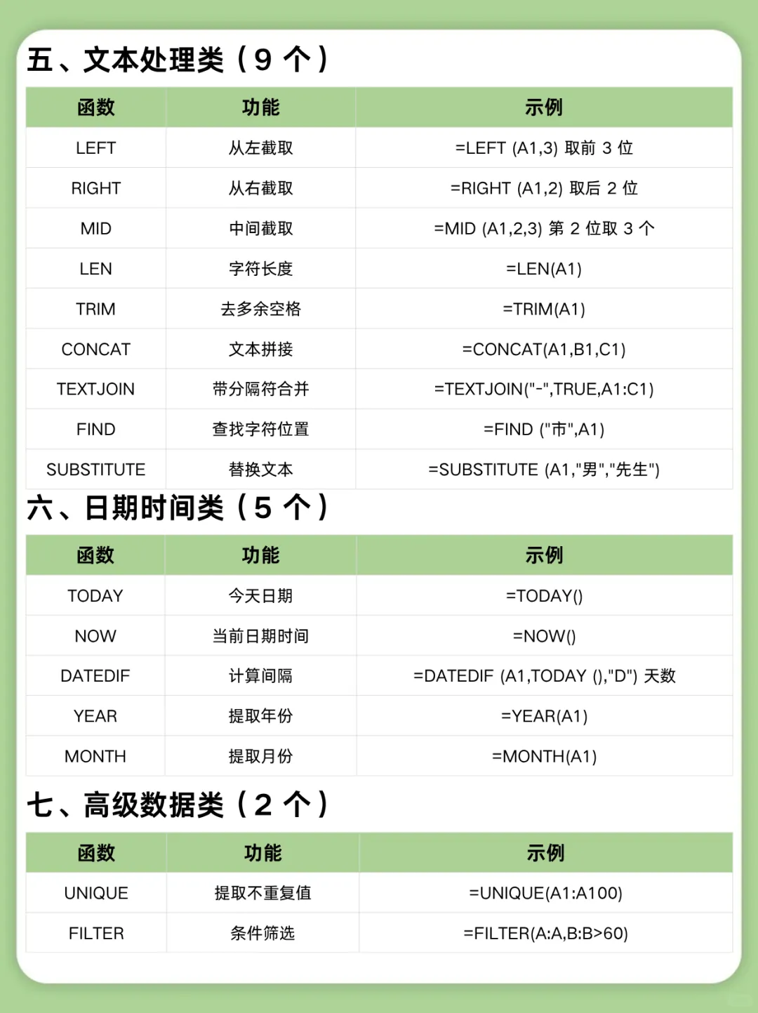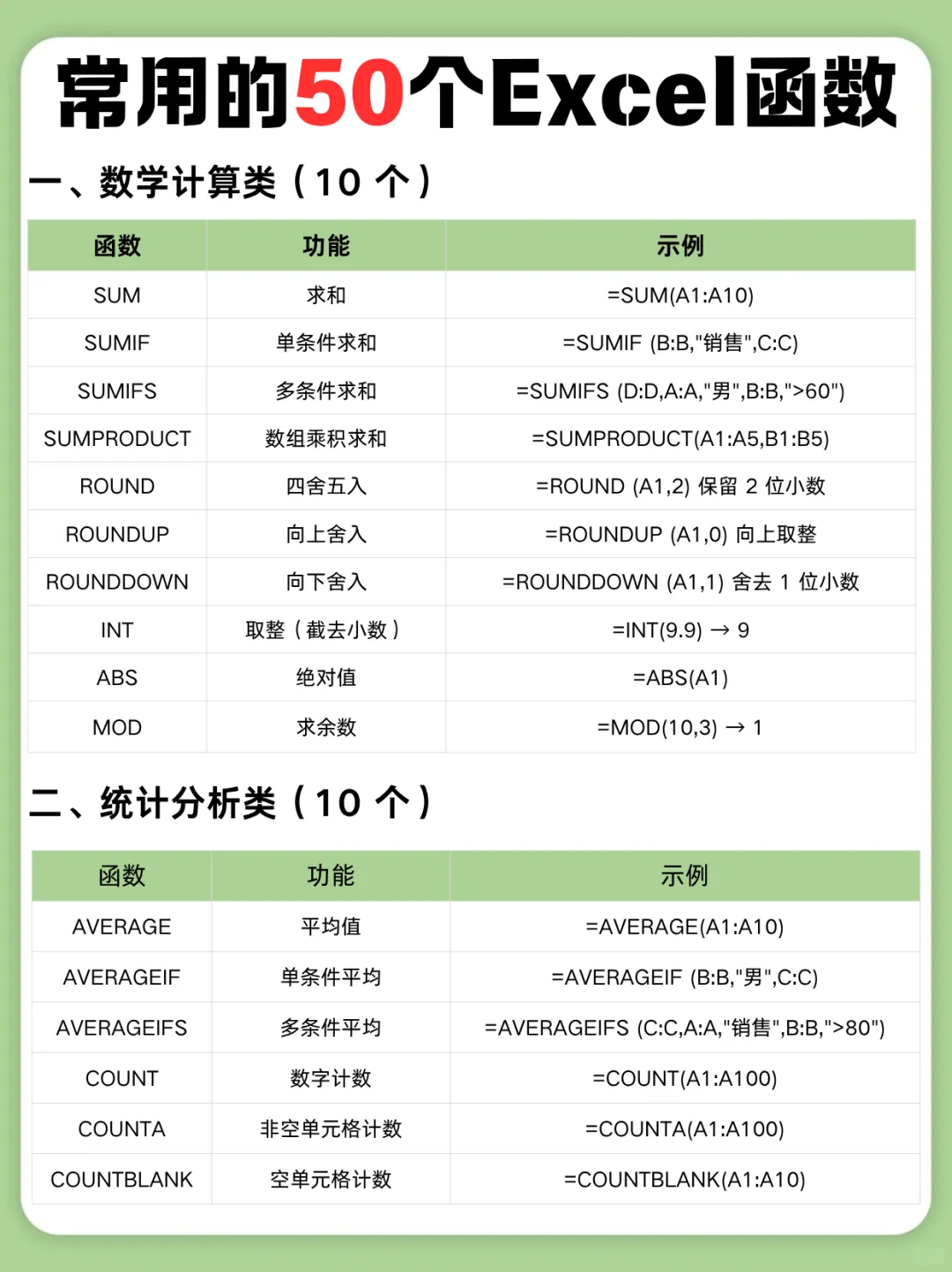 财务、文员等职场人必备的50条Excel函数,公式记于心下班快人一步 对于财务、文员等职场人Excel既是基础也是核心生产力。 每次遇到复杂需求就难以按时为完成工作,那一定是常用的函数没有掌握,这一份50个常用的Excel函数,覆盖了90%的办公需求场景,下面从七大类函数介绍说明,记下它让你从小白变成办公高手。