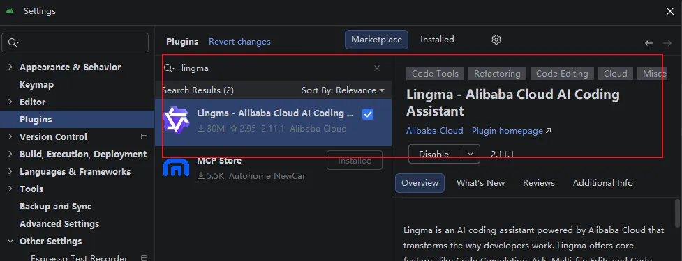 在File->Setting->plugin插件中搜索“lingma”,然后点击install安装即可。