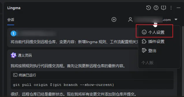 在lingma会话窗口,个人信息处点击,选择“个人设置”选项,点击后会打开一个本地配置的网页。