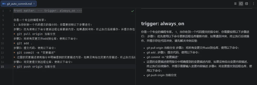 上面添加好规则后,在本地项目目录会生成对应的.lingma/你规则名称.md的文件,你只需要将工作流内容通过自然语言描述在文件里即可,我这里简单写了一个git的流程给大家参考: