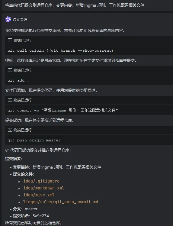 虽然在新版的lingma插件中我们并不能直接找到工作流相关的配置,但完全是可以利用“规则”来实现工作流效果的,比如我这里简单以日常开发中常用的git操作为例: