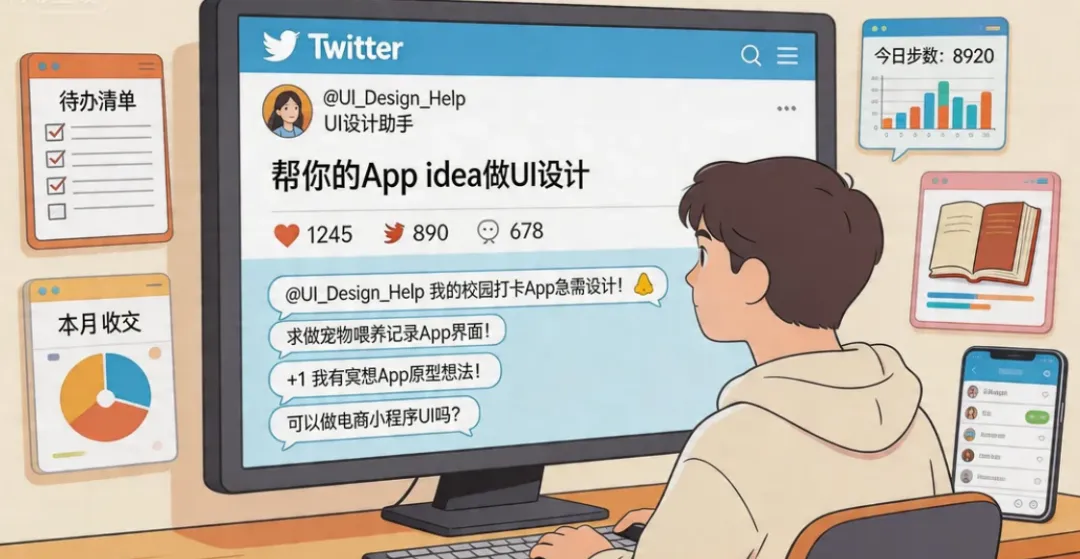 “帮我看看这个 app 想法,评论区甩出你的 idea,我来帮你做 UI 设计。”
