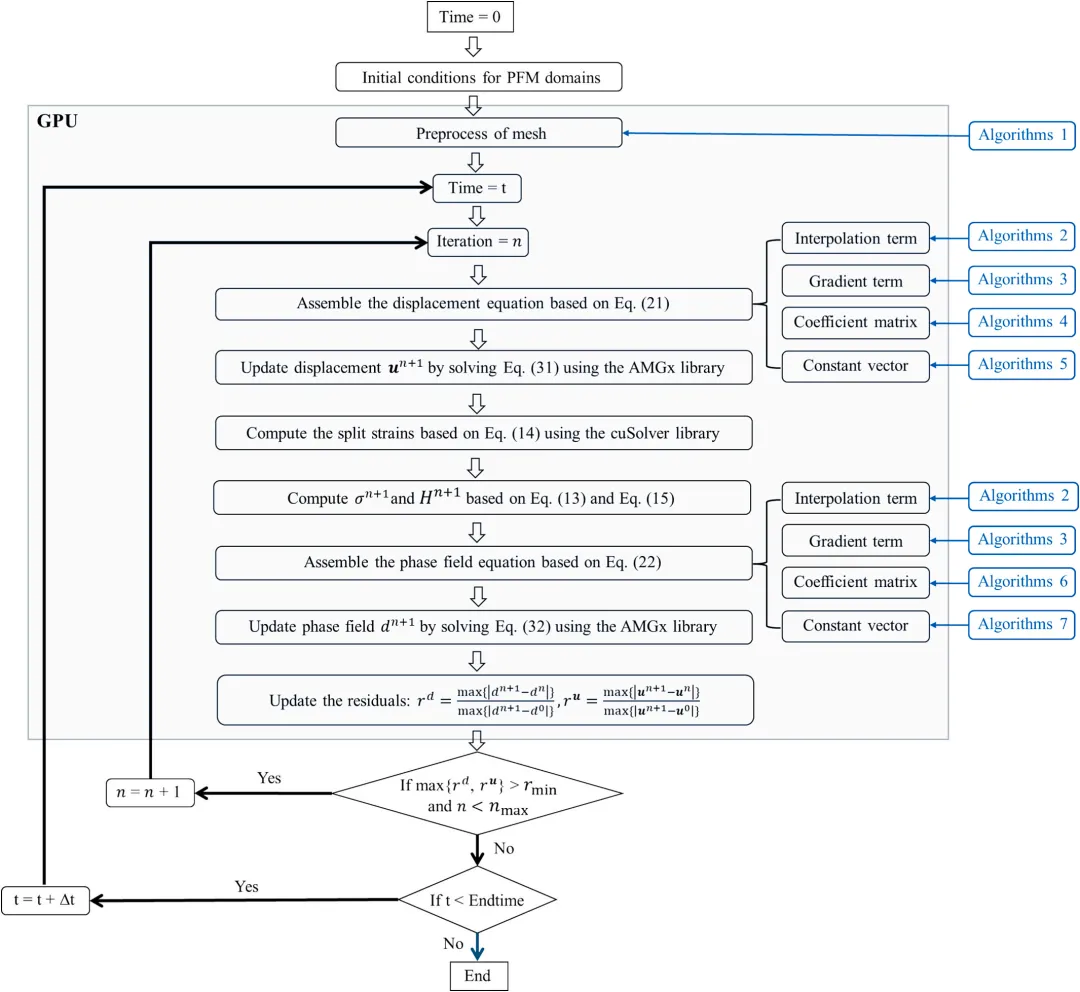 本文的核心创新在于首次实现了基于非结构化网格的相场法全流程GPU并行计算框架,彻底摒弃了传统的域分解CPU并行策略,构建了完全驻留于GPU内存的一体化计算流程。具体创新性体现在: