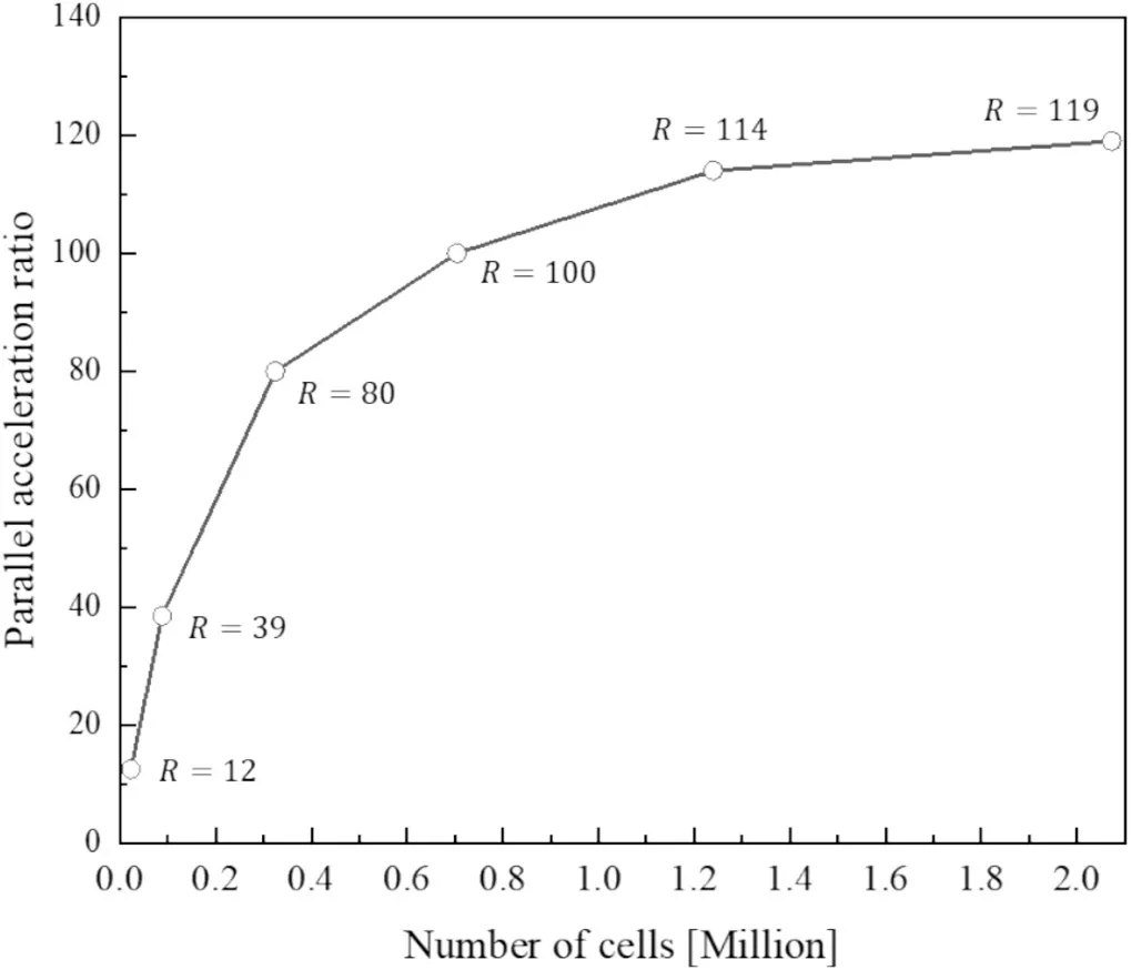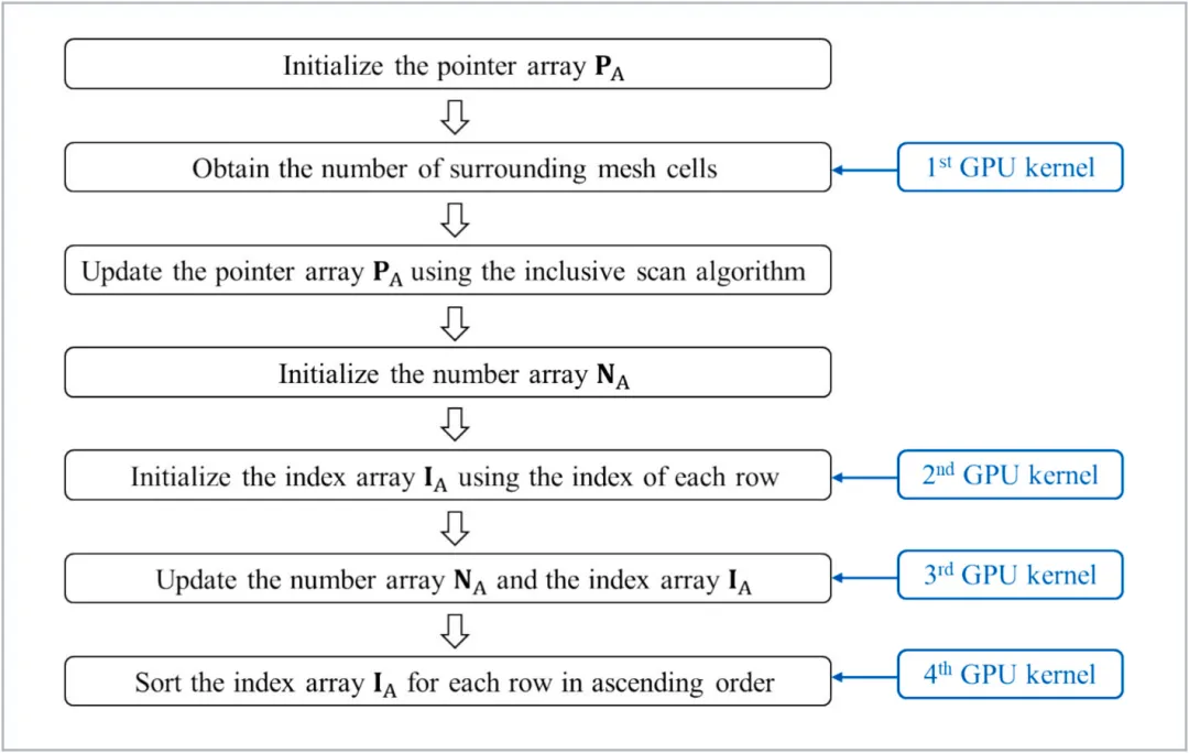 数据结构优化:采用面结构(face-based)拓扑描述非结构化网格,通过CSR(Compressed Sparse Row)格式高效存储稀疏矩阵,结合原子操作(atomic operation)处理面–单元关联计算,避免了复杂的几何域分解,天然适应GPU的细粒度并行架构。