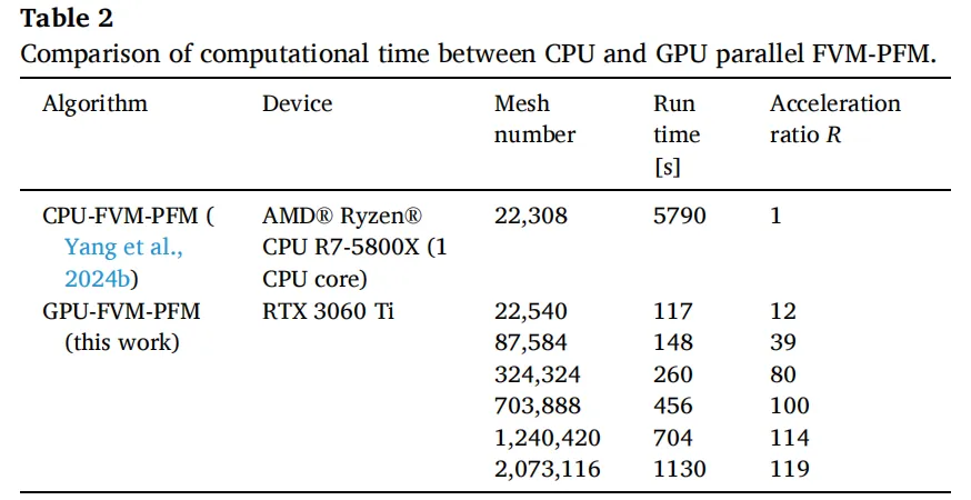 显存容量限制:当前100万网格约需1.2 GB GPU内存,即便使用RTX 4090等高端显卡,单机可处理网格规模上限约为2000万,限制了更大尺度(如工程尺度)问题的直接模拟。未来需发展多GPU并行算法(multi-GPU domain decomposition)以突破单卡内存瓶颈。
