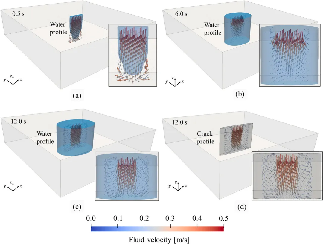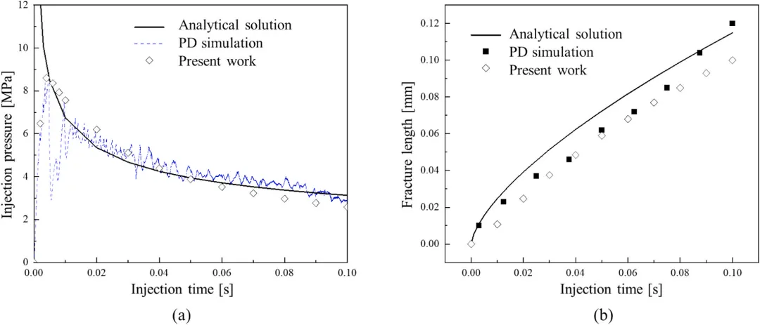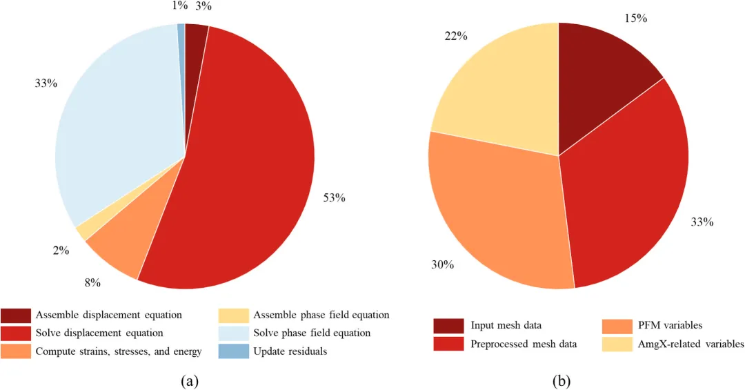 多物理场耦合验证:成功实现了与两相计算流体动力学(CFD)的耦合,准确复现了KGD水力压裂解析解及三维两相流驱动裂纹扩展过程,首次展示了GPU加速的相场–流体耦合框架在处理三维多物理场断裂问题中的潜力。性能分析揭示PFM计算耗时约为CFD的2.2倍,验证了针对PFM进行专项GPU加速的必要性。